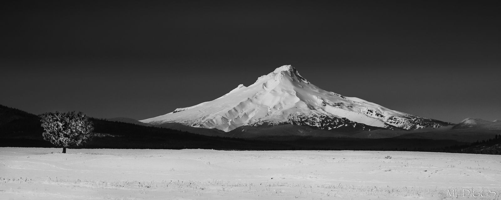 Marylynne, the whites here are real eye catchers. The close tonal match between the foreground and the mountain looks terrific. I think your pano crop fit the scene well. The tree shows nicely as well and makes a good visual foil for Mt. Hood. I do think that cropping a bit from the right (removing the ridge bump), to move Mt. Hood further right in the frame would make for more dynamic eye movement between the tree and the mountain. This is nicely dramatic in b&w.