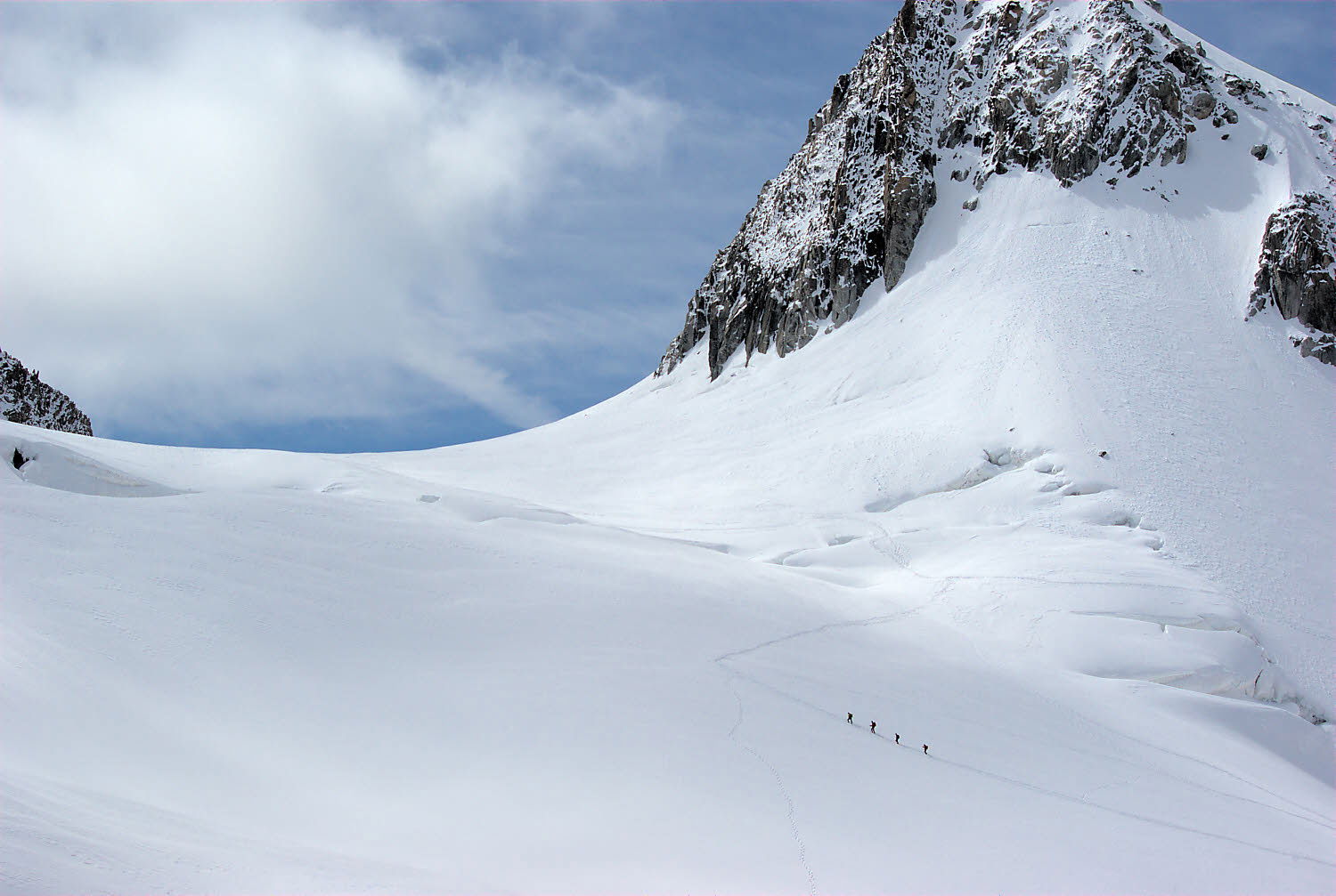 This was captured in the Mont Blanc region. I like the perception of solitude, as the mountaineers find their way in the snow fields on the glacier.