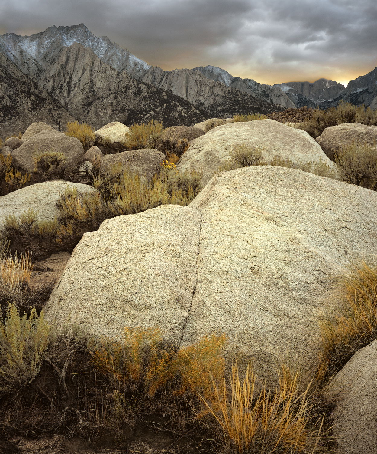 What a fine shot. The foreground boulders, the mountains, the sky are all just right. I wondered if the boulders should be that much brighter than the background but with a storm involved, the answer is yes.
