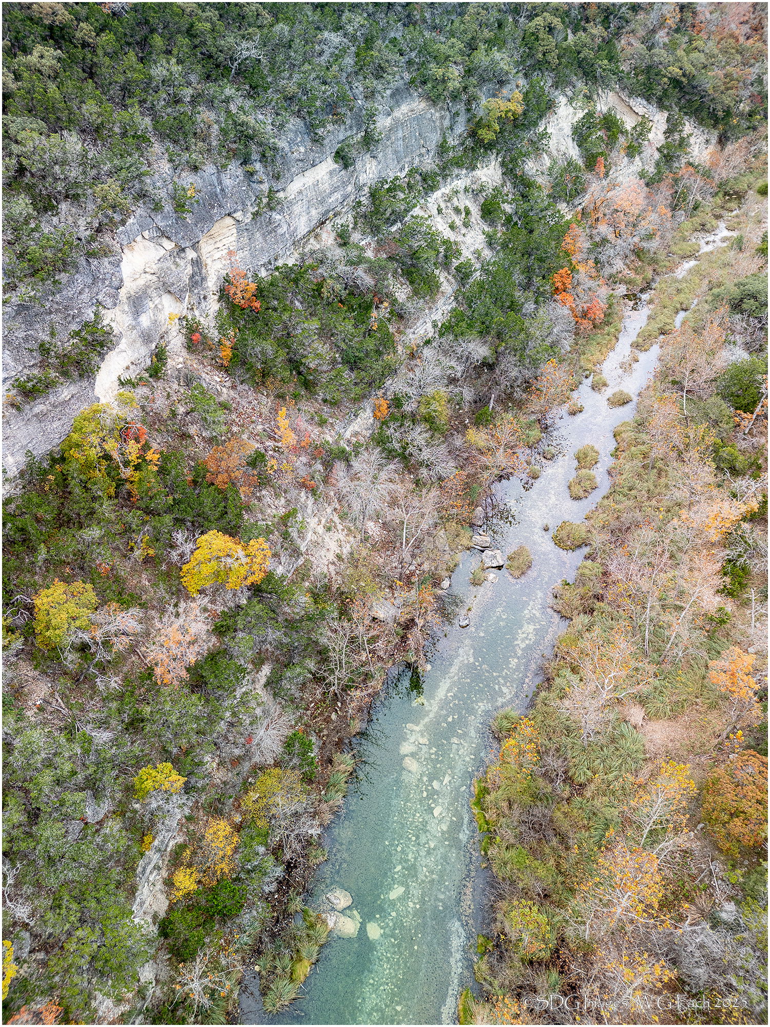 Fall comes real late to some parts of Texas. This was taken last December at Lost Maples State Park. The color changes there can be pretty spectacular although this past fall it was a bit subdued. I was looking to get a bird’s eye view of the limestone cliffs and the Sabinal River as it meandered by.>=))>