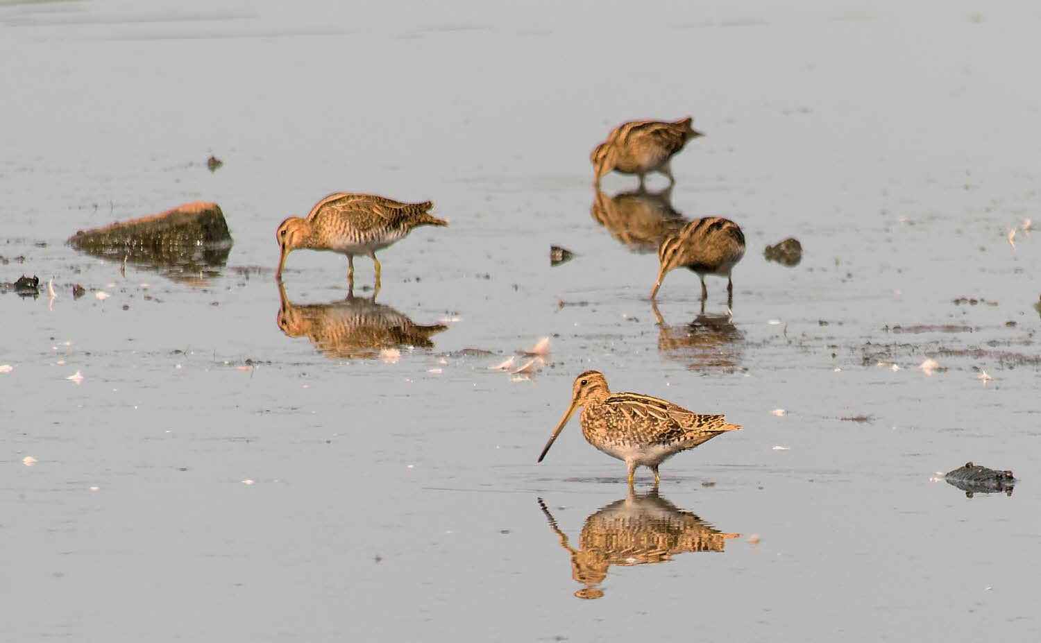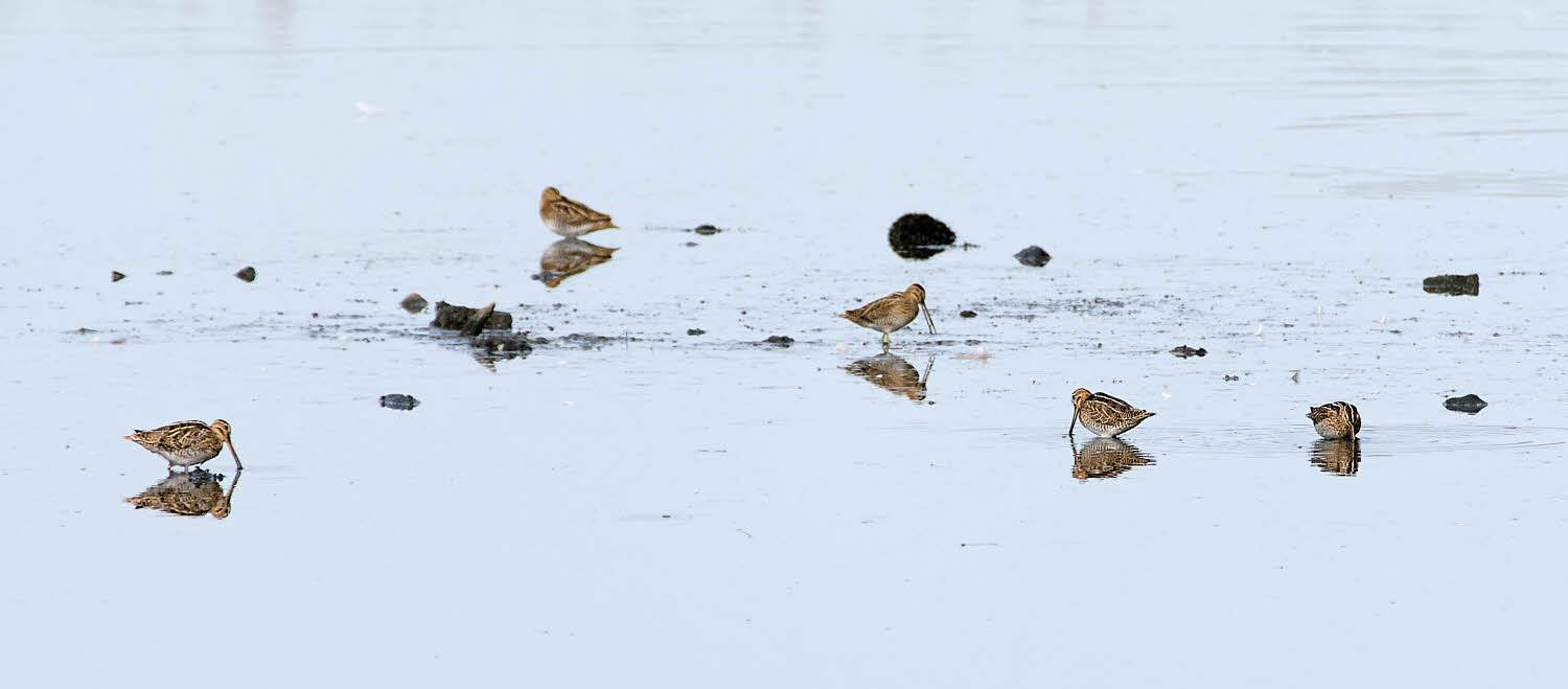 A nice environmental scene of the snipe’s feeding. The closer snipe show good detail and I like the overall composition.