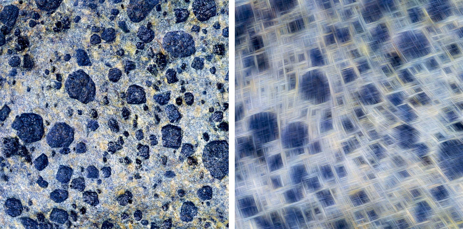 Focus-stacked texture detail of a roughly 4 inch mostly smooth river rock using a pair of stacked Vello EXT-NZ 12mm and 20 mm extension tubes on a 100-400mm telephoto lens. The “focus-shifting” feature on my Nikon body was used to capture the images. Helicon Focus was used to stack the images. Global image adjustments were done in Lightroom. The rest in Photoshop.