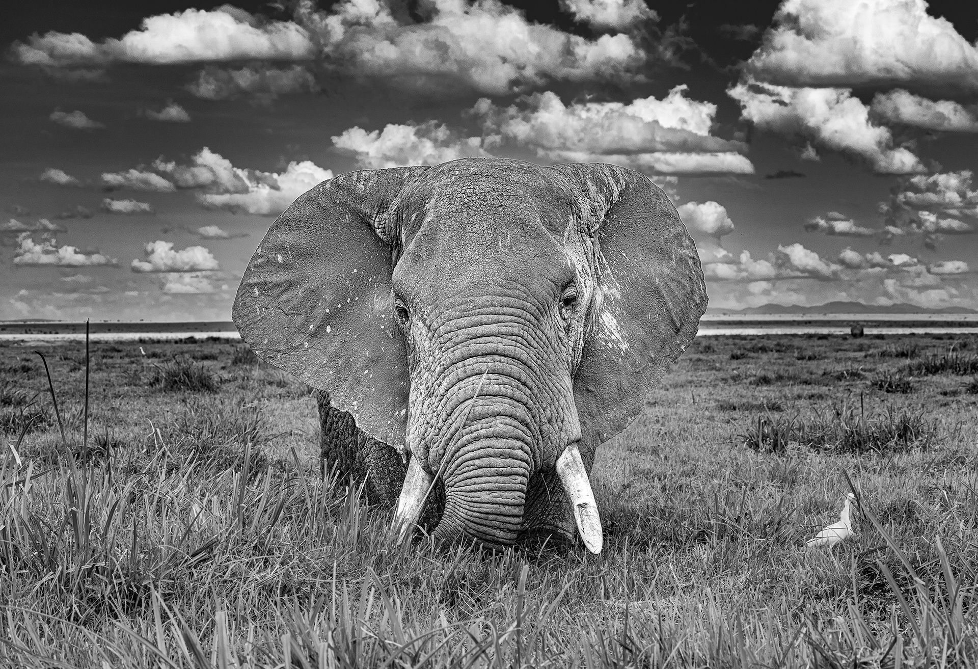 The straight on framing and slightly extending ears emphasise the huge size and power of the animal.