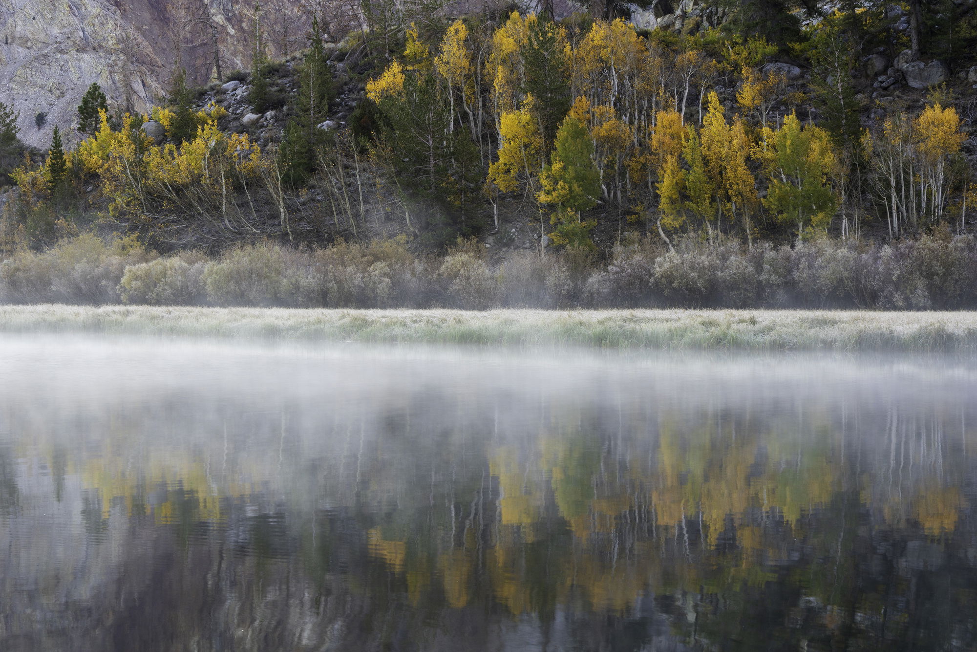 I’m not sure how I feel about the composition. I guess I feel like the right side of the image where the pine trees are cut off on the top of the frame make for a lot of tension (I’m also very curious what’s cut off and it just makes me wonder). I either don’t want to see them or I want to see all of them, however, I totally understand if there is something out of frame that hurts the composition even more by including it. I do like the mist on the water. It really adds to the Fall mood. I know how cold it can be up at 10,000 feet early in the morning at this lake. In fact, the last time I shot here I nearly frost bit my finger tips.