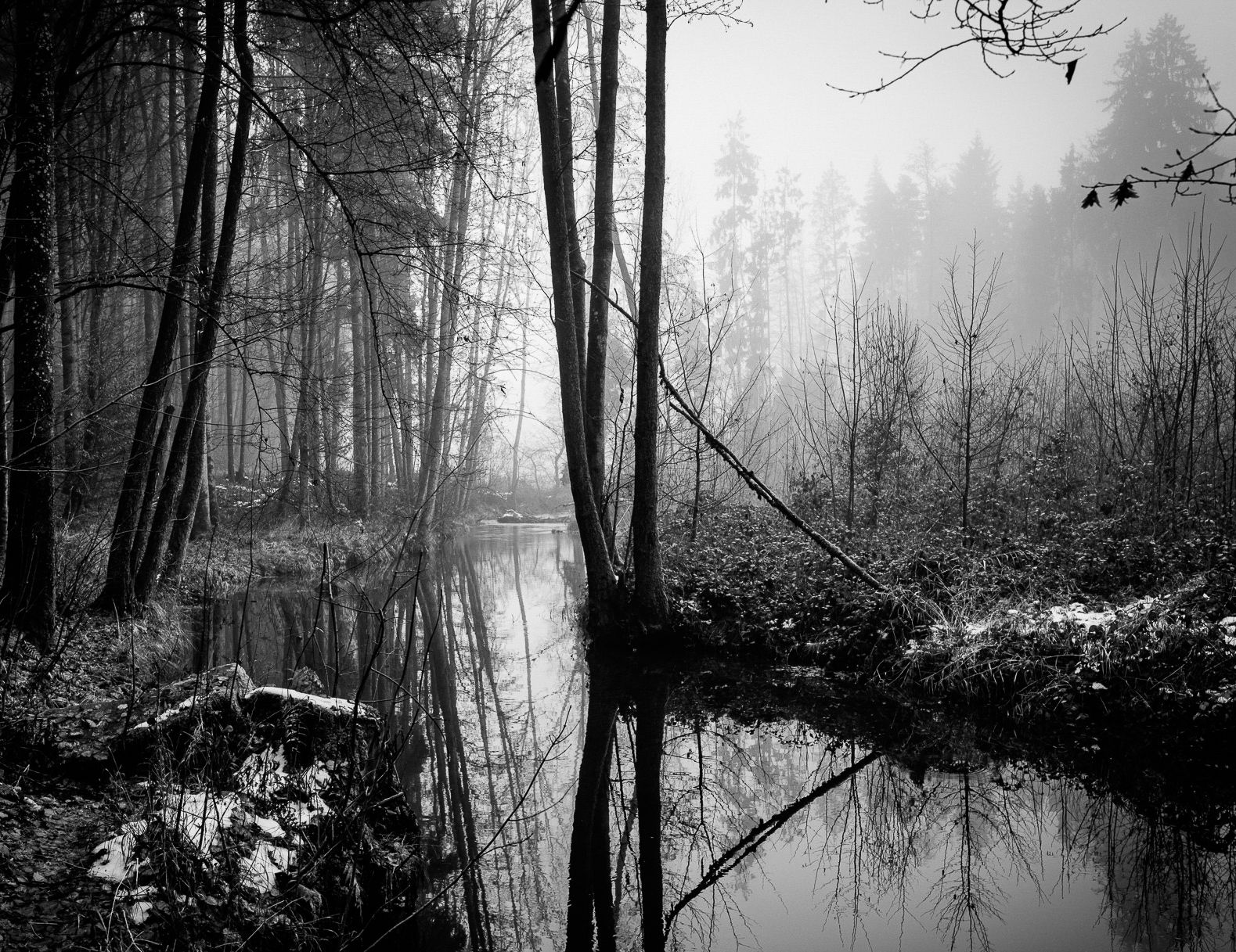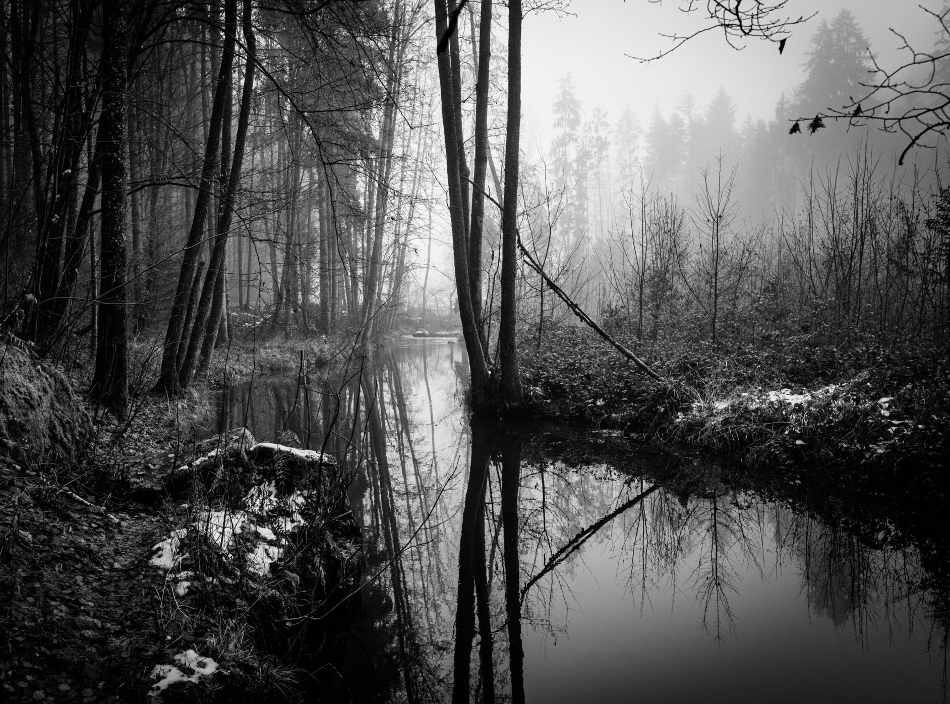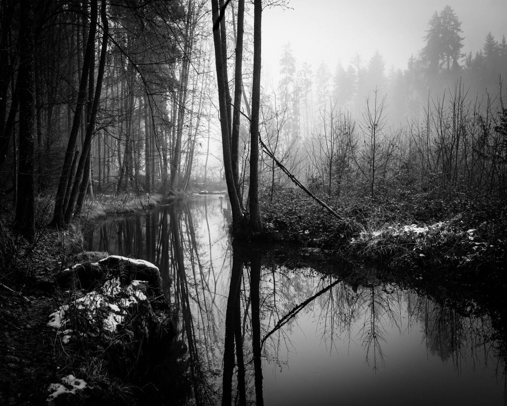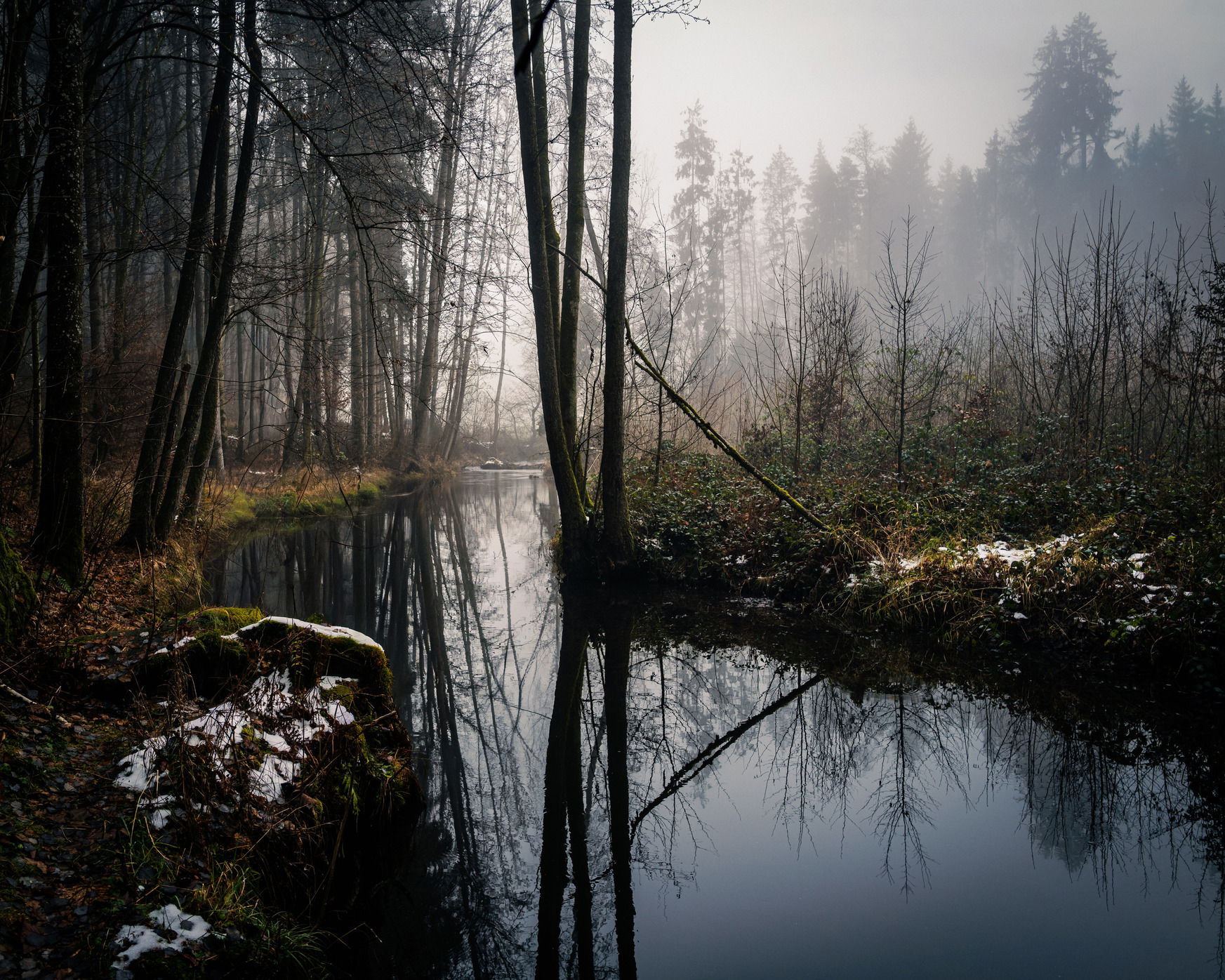 Hi Ralf - I understand your misgivings about this shot. The thing I noticed first was the almost perfect split in the scene with those big trees. It makes it difficult to find a cohesive flow. The misty parts at the back and toward the right are the most interesting to me, and if I’d been there I might have walked forward and cut the left part of the scene away, leaving just the big trees and the far bank as my working area. Pointing the lens in different areas and trying different arrangements and framing can really yield good results when there isn’t an obvious focus point. Maybe standing up where that log or rock is and getting all of the end of the water between the banks would be a nice alternative if you ever visit again or if you have more scenes to work with. Moving there would probably get rid of the branches coming in from the top, too. The mist is very attractive as are the pockets of snow. The water course gives it a good sense of depth, too.