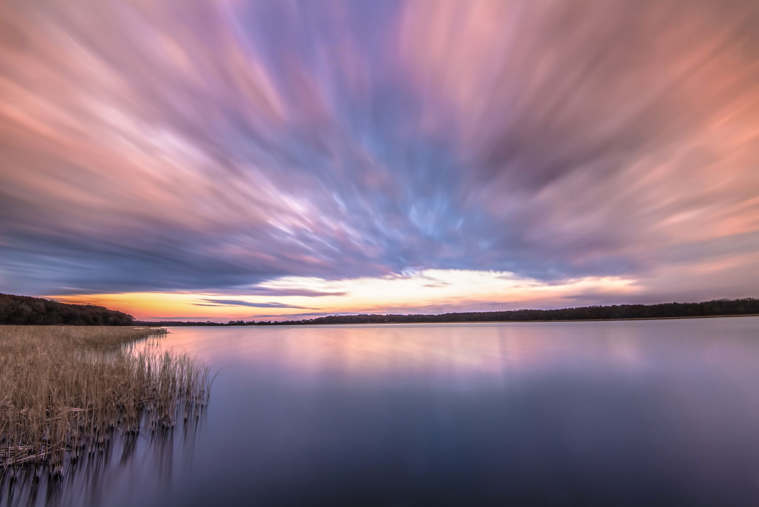Other than the mentioned tilted horizon (and toss in some barrel distortion too?) I find your processing to be quite nice, spot on actually. The streaking clouds make it for me so I’m less concerned about the reeds - although I would say you have included just enough to know they were important to you, and not an oversight.