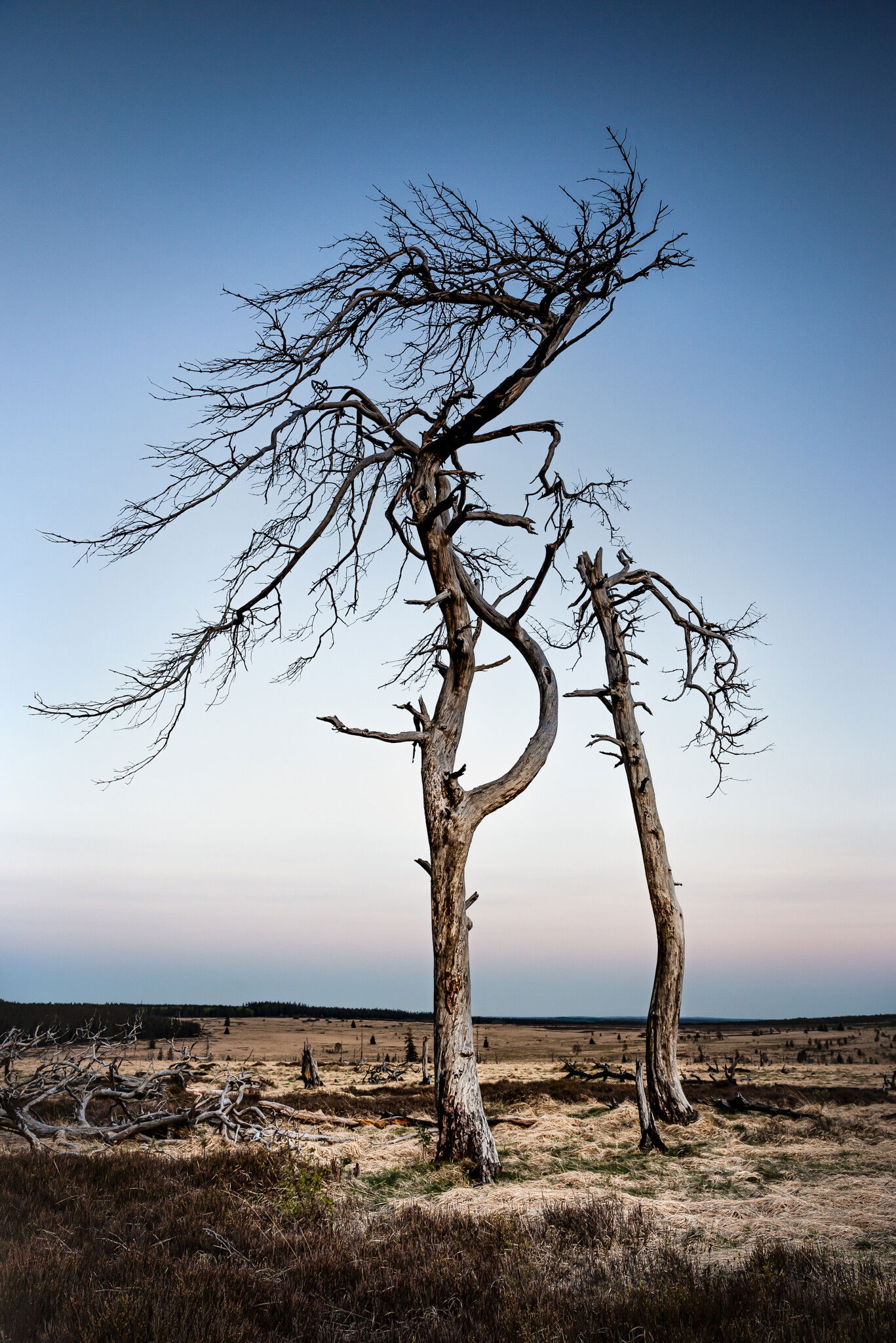 This image has to be seen large in order to really appreciate it. The I love the gnarly nature of the limbs and branches and the debris from the top of the right tree on the ground. This really tells a story. The moon doesn’t add anything significant so I would clone the moon out. I love the tilt of the limbs on the left tree and the out of character half circle. Friends forever. I really like it.