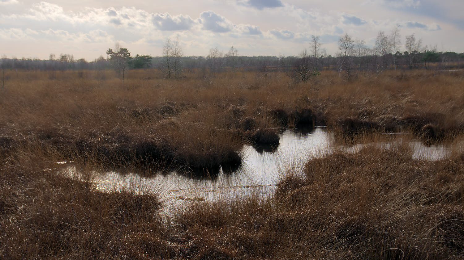 Nitrogen deposits from nearby agriculture, from traffic and industry have enriched the soil and moor grass has replaced the original heather vegetation. Fortunately, the area is part of a NP, and the ground water level is kept high in spite of the demands of the agriculture in the neighbourhood (they like their land dryer). Underground water barriers try to satisfy the contrasting desires.