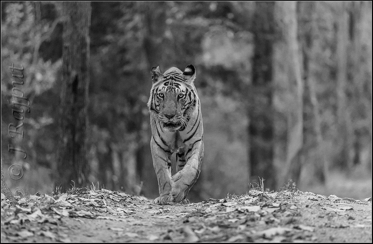A great low angle for this shot, Jagdeep. The B&W works very well. I like the slight oof foreground as it accentuates the feel of being low and potential prey for this beauty. I could see cropping some off the sides, but I’m not sure it would add to the impact-just something to think about.