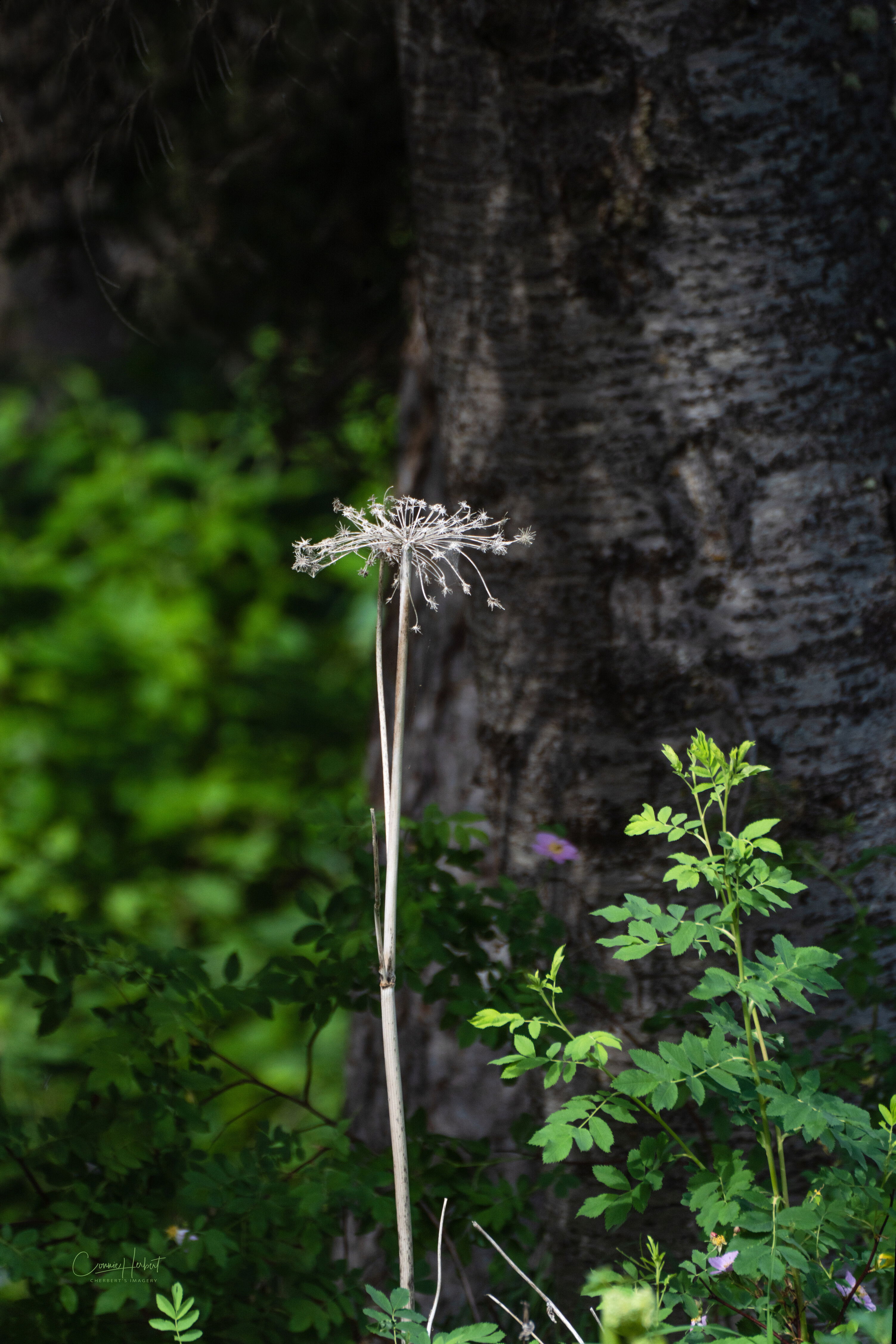 Hi Connie, welcome to Flora! This is such an interesting example of a flower gone to seed. Congrats on seeing it in the first place. So many of these go unnoticed even though they have their own beauty and individuality. That said I think a step to the left might have helped this be even more striking. Often when I see a flower in the undergrowth I try to find something that will help isolate it and a big tree is a good way to do it. So I think placing this 1/2 on the green and 1/2 on the tree is an interesting choice. As you have it a crop would help us concentrate on its intricacy and detail. Keep 'em coming!