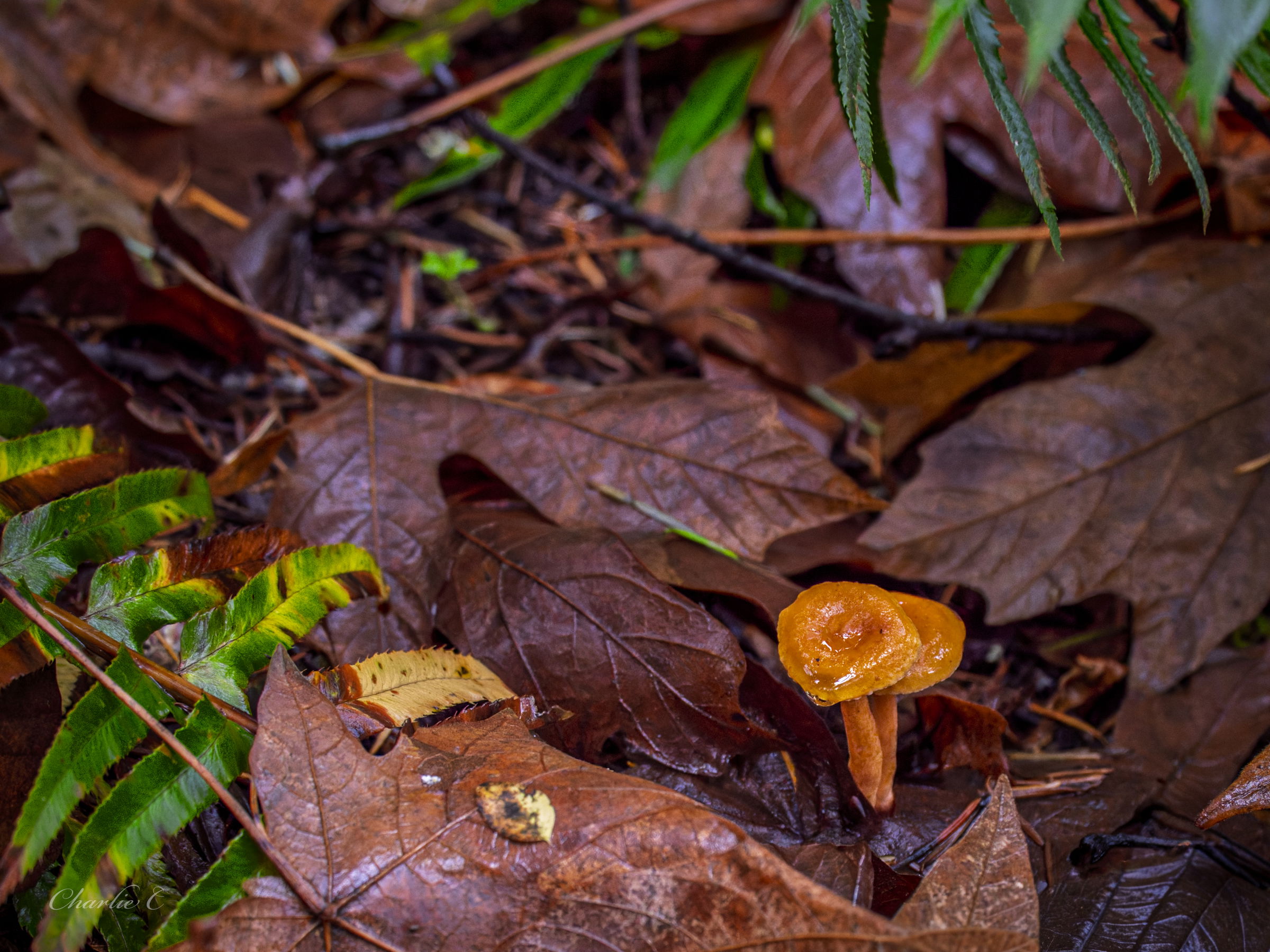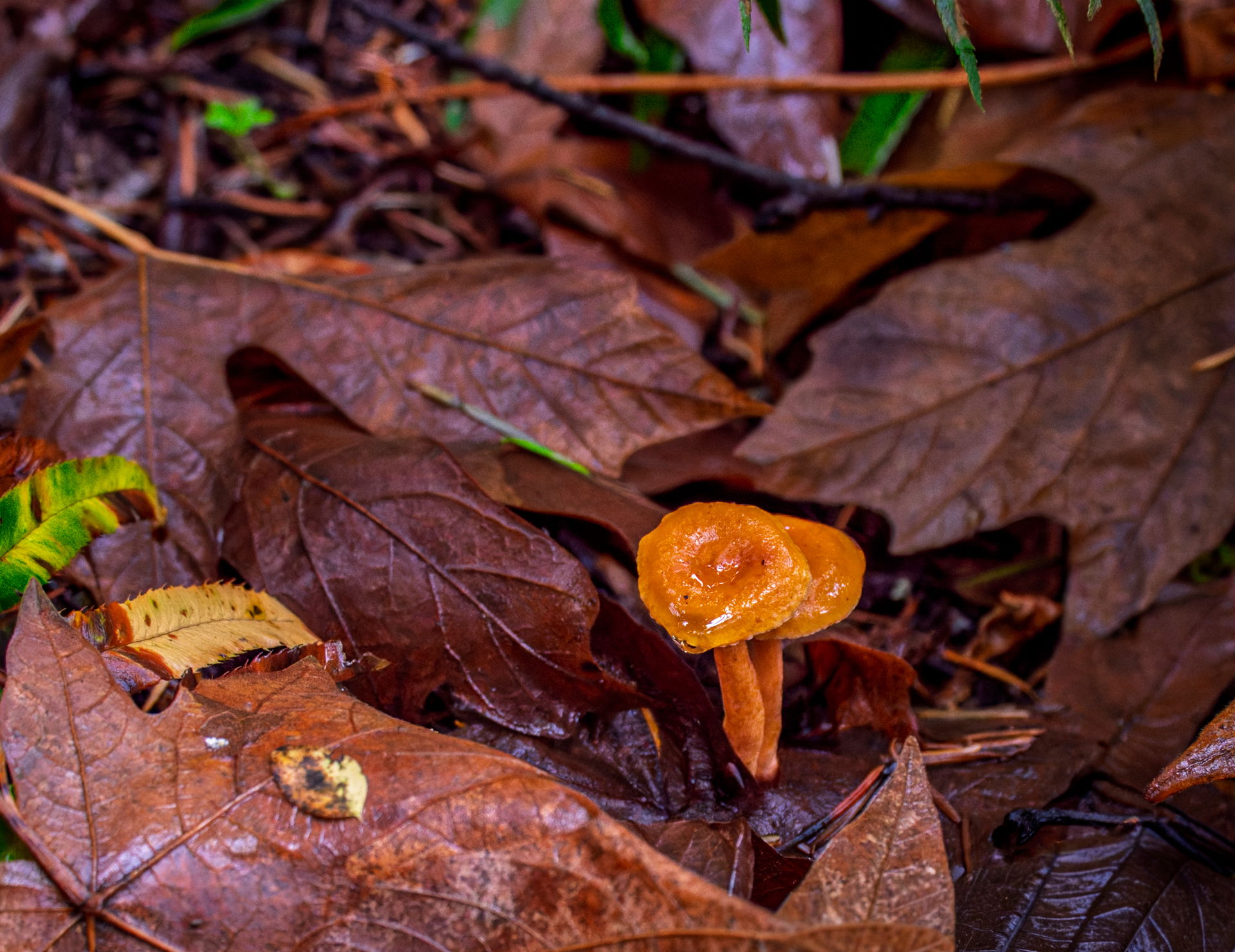 Fall mushrooms are often a surprise. This pair looks tiny surrounded by the mix of fallen leaves and dying ferns. The wetness is god for the mushrooms.