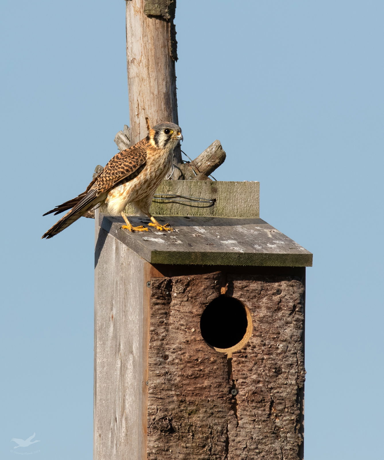 I put this Kestrel box up winter before last. Last year, the only things showing an interest were Starlings, so I boarded it up. This spring a flicker looked interested, so I uncovered the entrance. Shortly thereafter a pair of Kestrels started paying attention to it. They’ve been in and out of it for the last month or so and this image of the female was taken about a week ago. I’ve tried to be very circumspect, so this was taken at quite a distance from my blind which happens to have a view through the entrance door. As the season progresses, I’ll move closer. We’ve seen the pair mating the last couple of days. so hopefully they’ll start feeding chicks in a month or so.