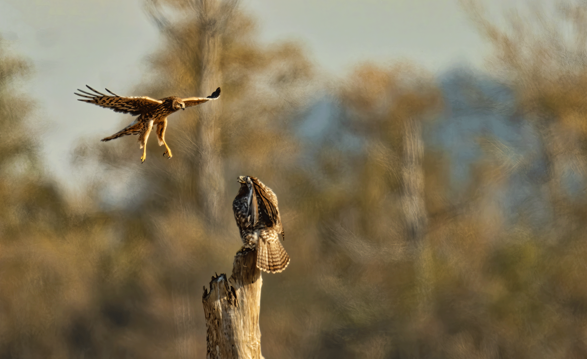 A couple of what I think are Northern Harriers fighting over territory. There is a lot of processing in these images because they were so far away. But the action is worth it I think. The perch is about 200 m from the camera. The background trees are approximately 600+ meters from the camera position. It certainly created an interesting effect.