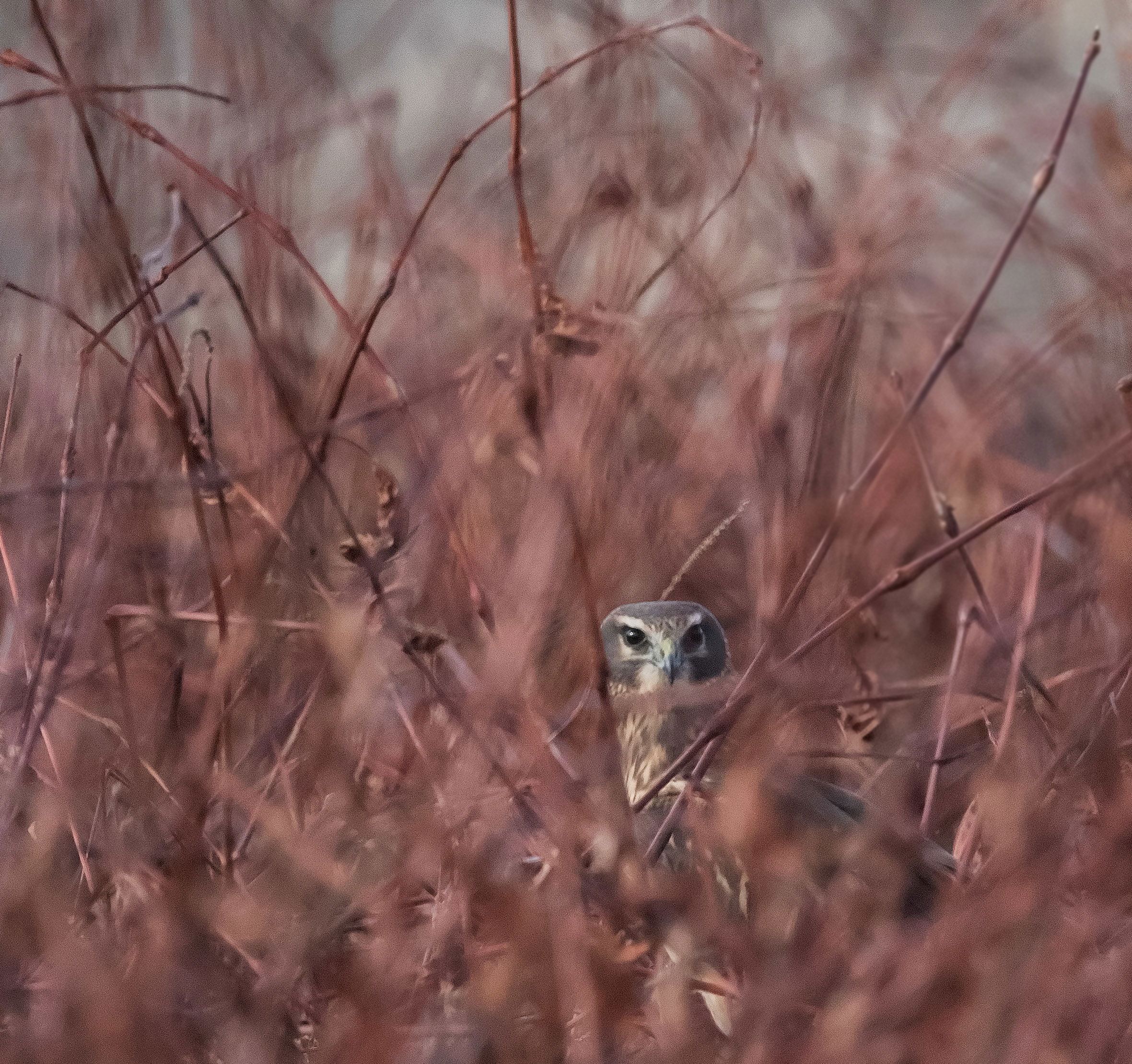 I really like the environment that you found this bird, Steven. The reddish brown vegetation really brings out the best in the bird. @Paul_Breitkreuz is right, this is a Northern harrier and it looks like a juvenile one based on the coloration of the eyes.