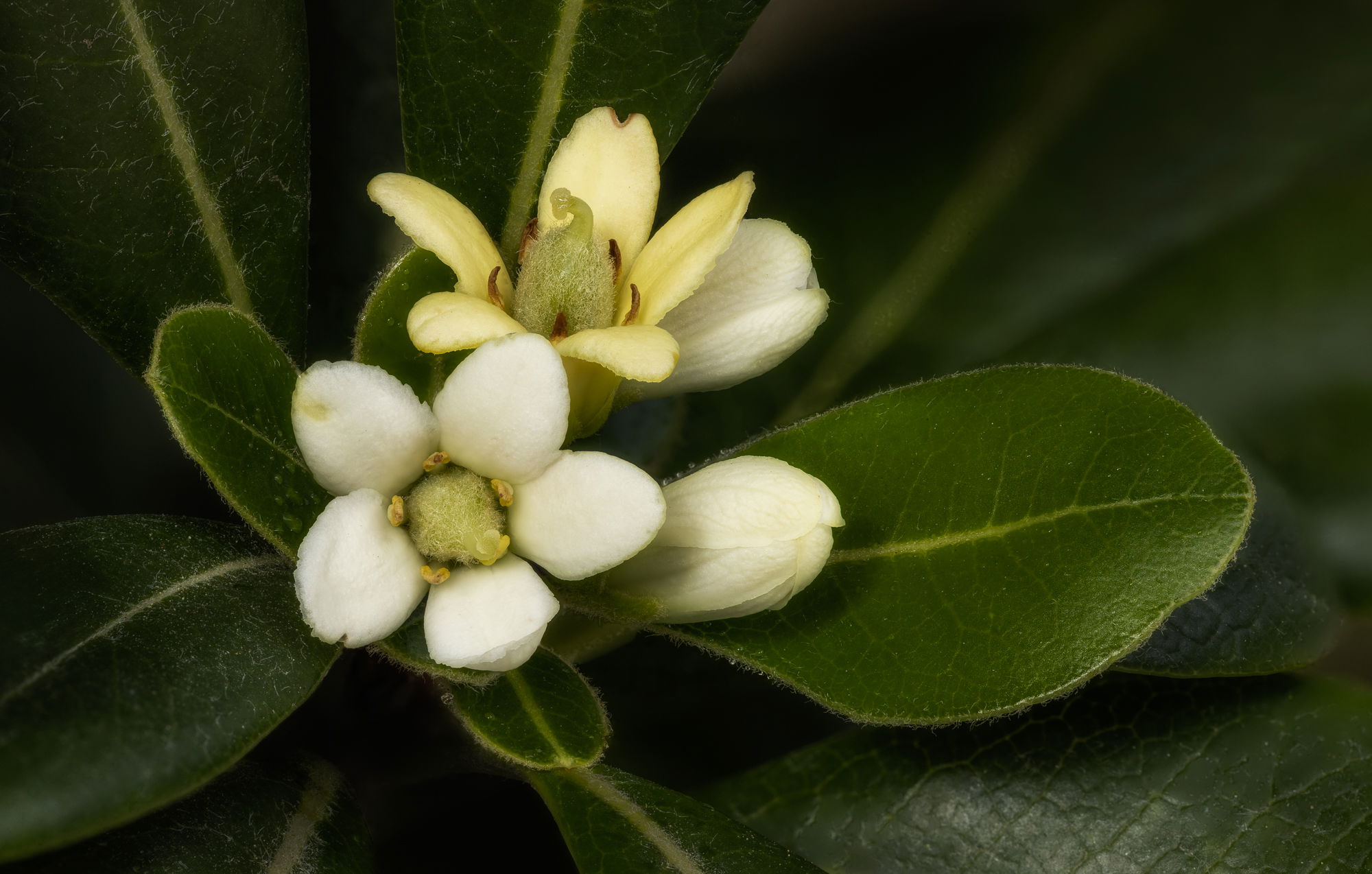 The leaves remind me of laurel, but the flowers are so tiny (or is that just my imagination?) - I love them for the sweet quality they present by my thinking they are small. I also like the radial lines aspect of the leaves main veins pointing straight to them. The little buds and the older one are equally nice as they expand the cycle. Stack looks good. The wb seems a tad warm to me, but it might be dead on since I wasn’t there. Glad you found them!