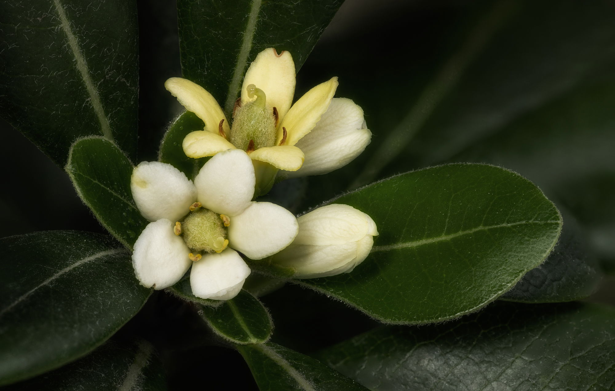 Thanks, @Dennis_Plank and @Kris_Smith! Kris, you’re right about the color cast – I let myself get seduced by warm tones. The leaves are a dull dark green but not yellowish. (RP above.) The older flower was warmer and I was trying to emphasize that. This morning the two buds are half open and the two older ones look the same, as far as I can tell without a magnifying glass. They do look tiny – I was surprised when I measured them to see each individual flower is 1". I was guessing the group was that size.