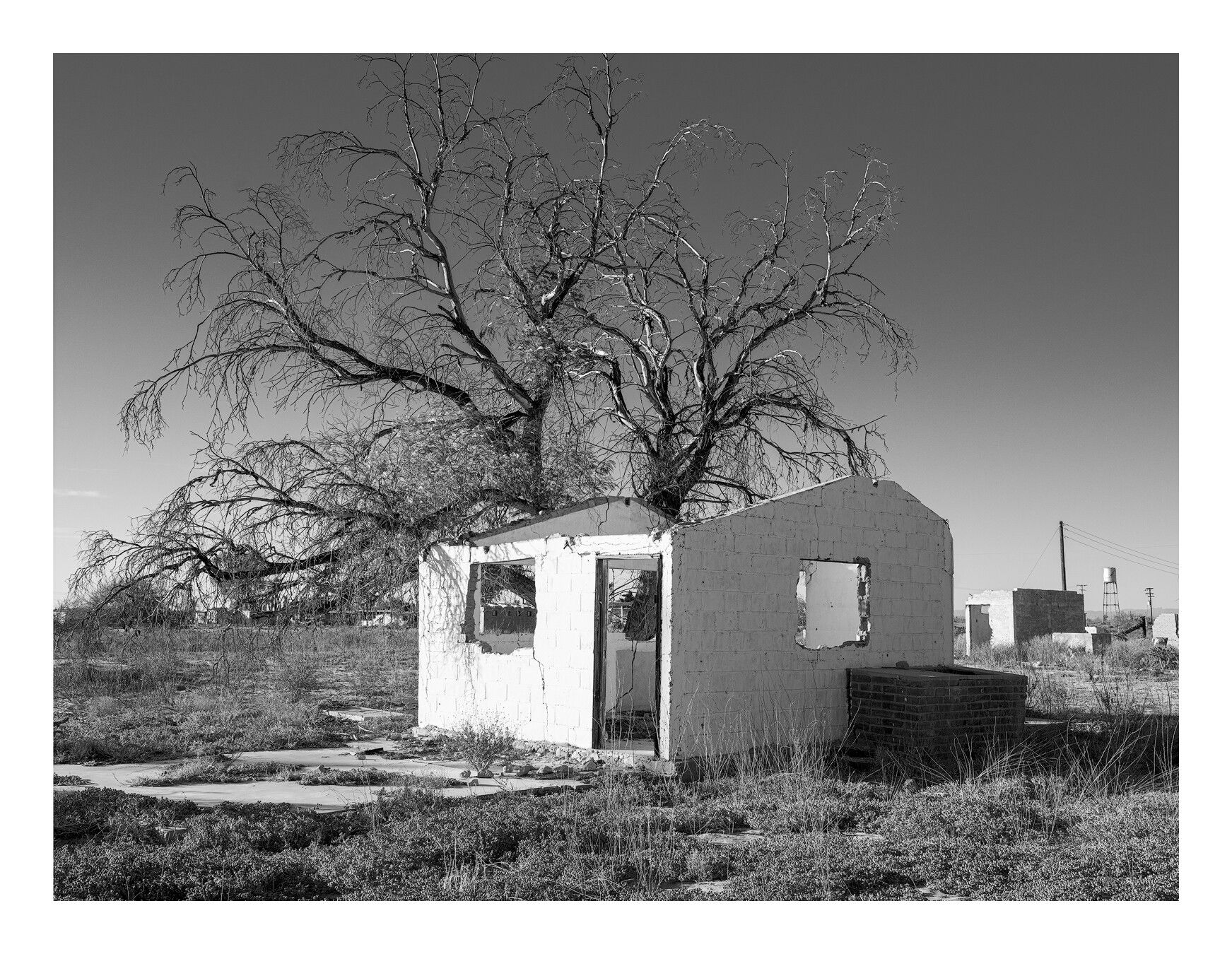 Thank you for your comment. Yes, this appears to be a small abandoned community near the highway. I have passed this building many times and am always impressed by it. To me it’s a house with horns. That’s the impression you get when you see it. The dead tree seems to come right out of the house as though part of it. I have tried to convey that look but am not sure it’s there. I have shot it from many angles (my sprained knee can attest to that) and this seems closest to what I’m trying to get across. I have shot it with greater space around it, have included the fence in front of it. have shot from different sides, and even shot the interior. You can’t darken the sky for drama because you lose the impact of the tree.