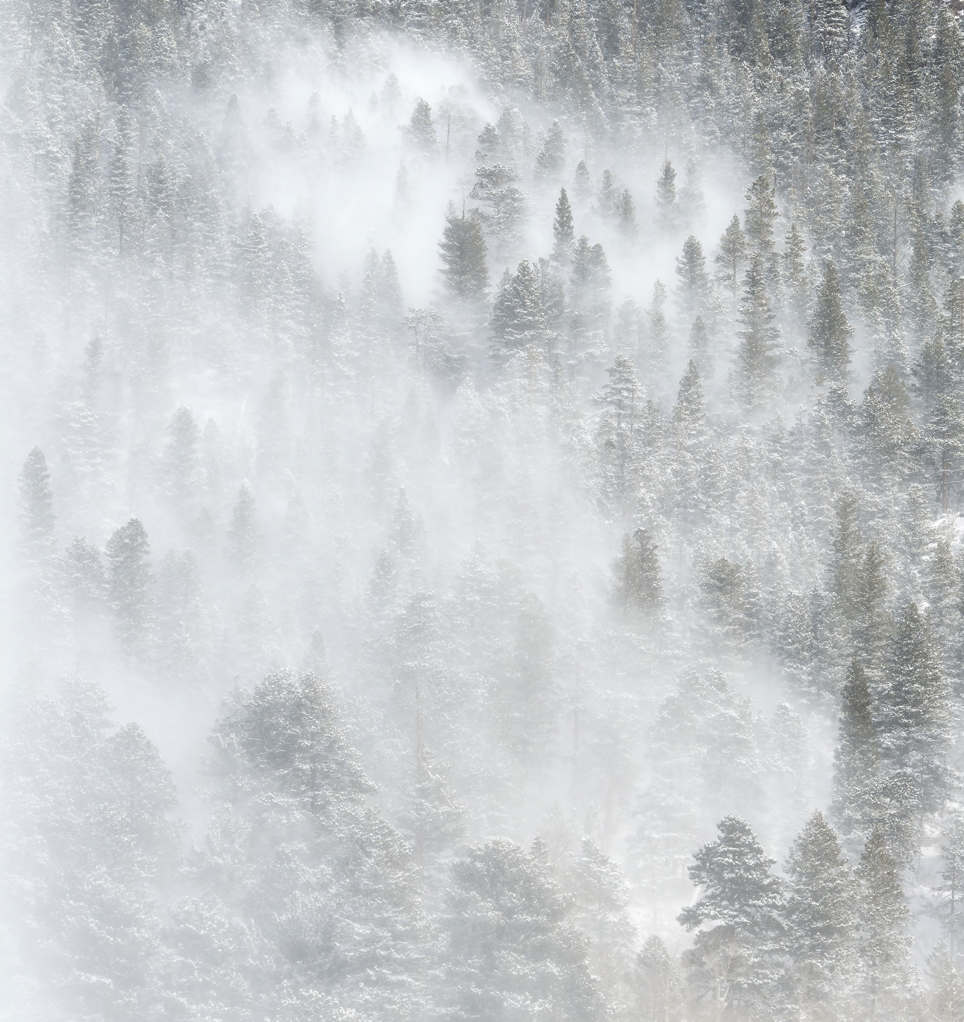 I captured this image with a telephoto lens 100-400 The image is cropped to about half the size as I wanted to concentrate on the OM graphic formed by the trees. The wind/snow was moving fast and in and out of trees so this “graphic” did not last.*