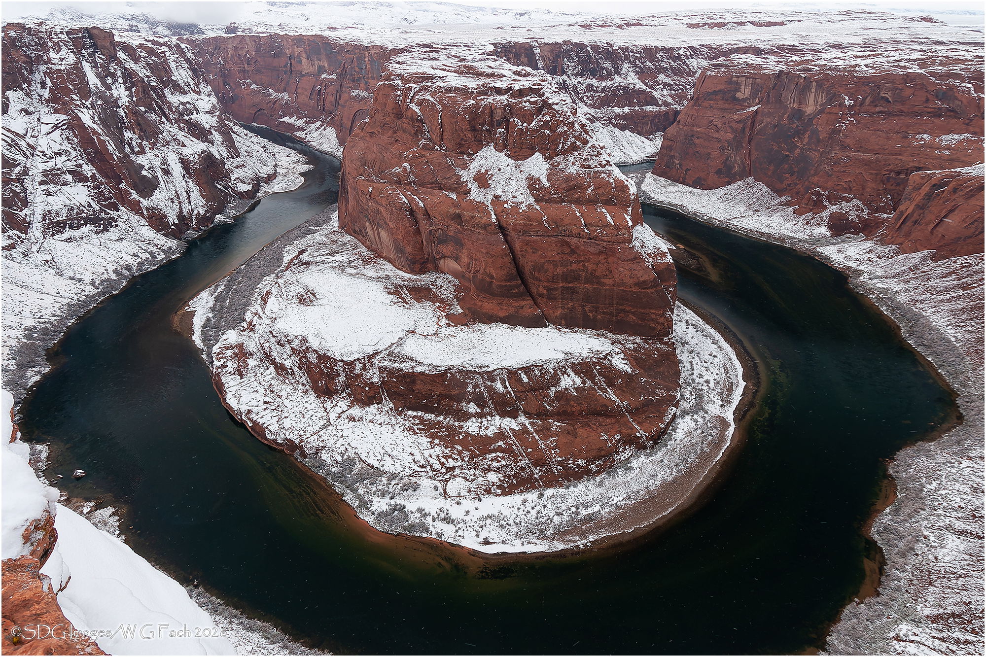 Bill, your adventure gave you a fine view of Horseshoe Bend with a fine dusting of snow. The snow and the overcast do a good job of emphasizing the deep colors in the river and the red rocks.
