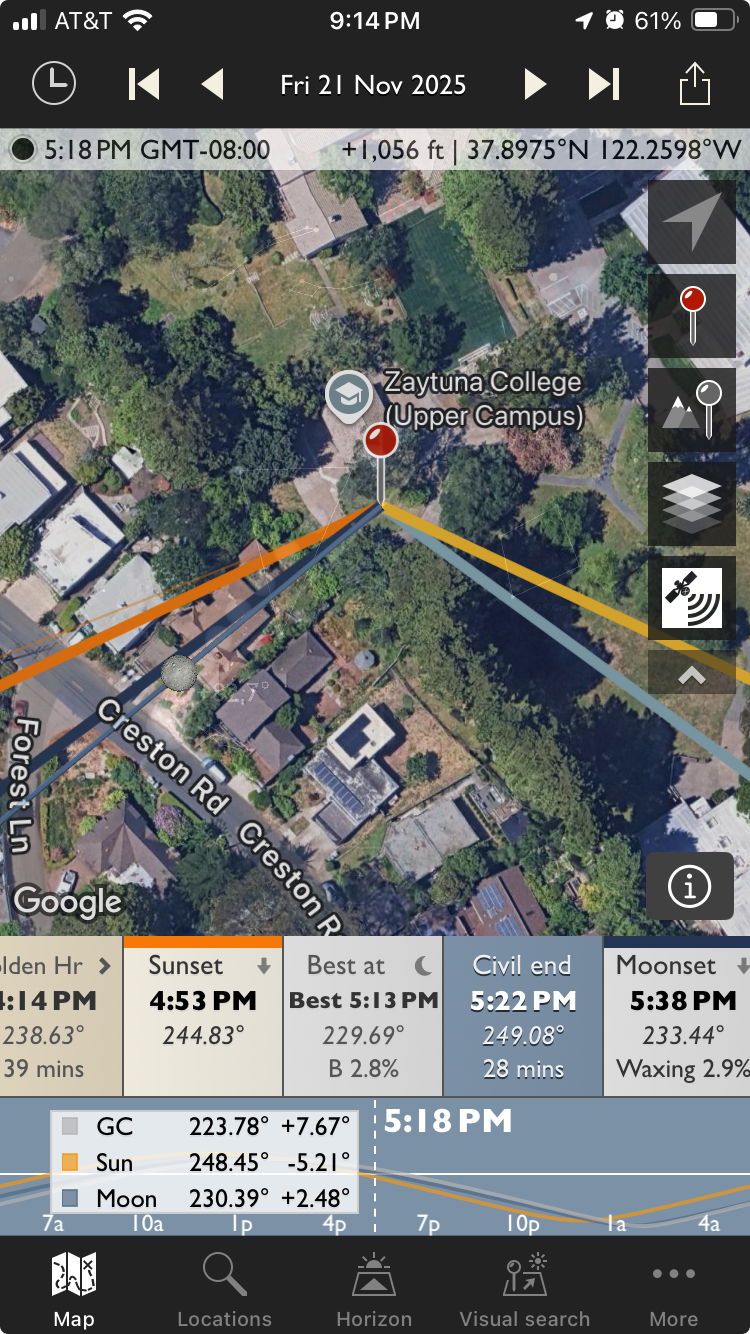 @Tony_Siciliano , it was taken on Friday November 21 that particular frame was at 5:18 pm. I was in the Berkeley Hills just off of Grizzly Peak Rd. December 20th will be the next day a new crescent will be back in the post sunset sky.