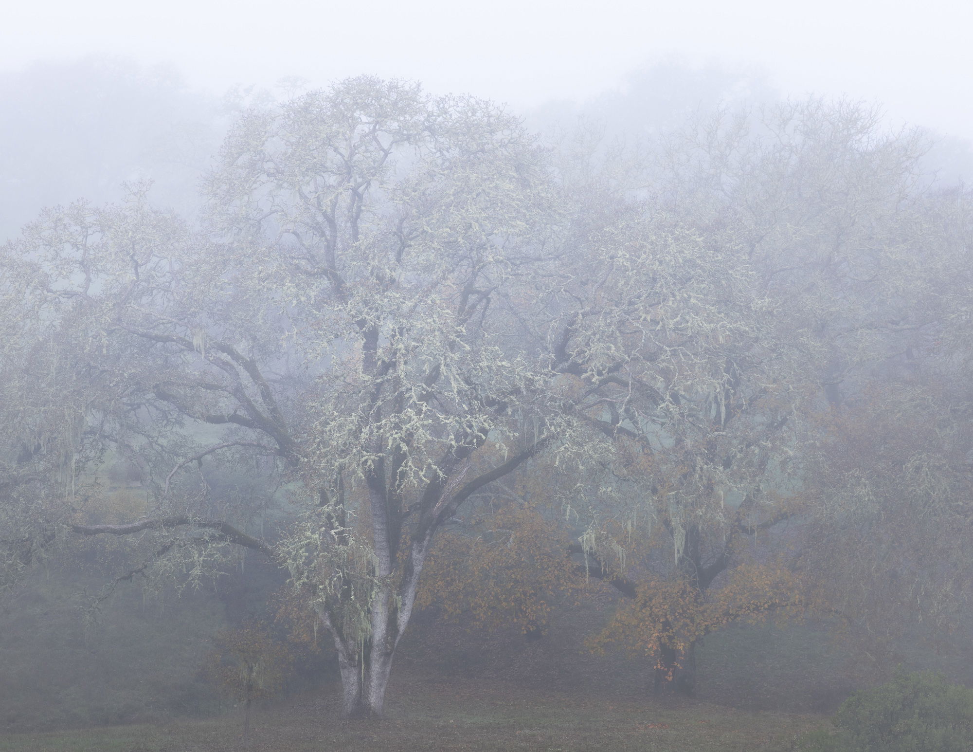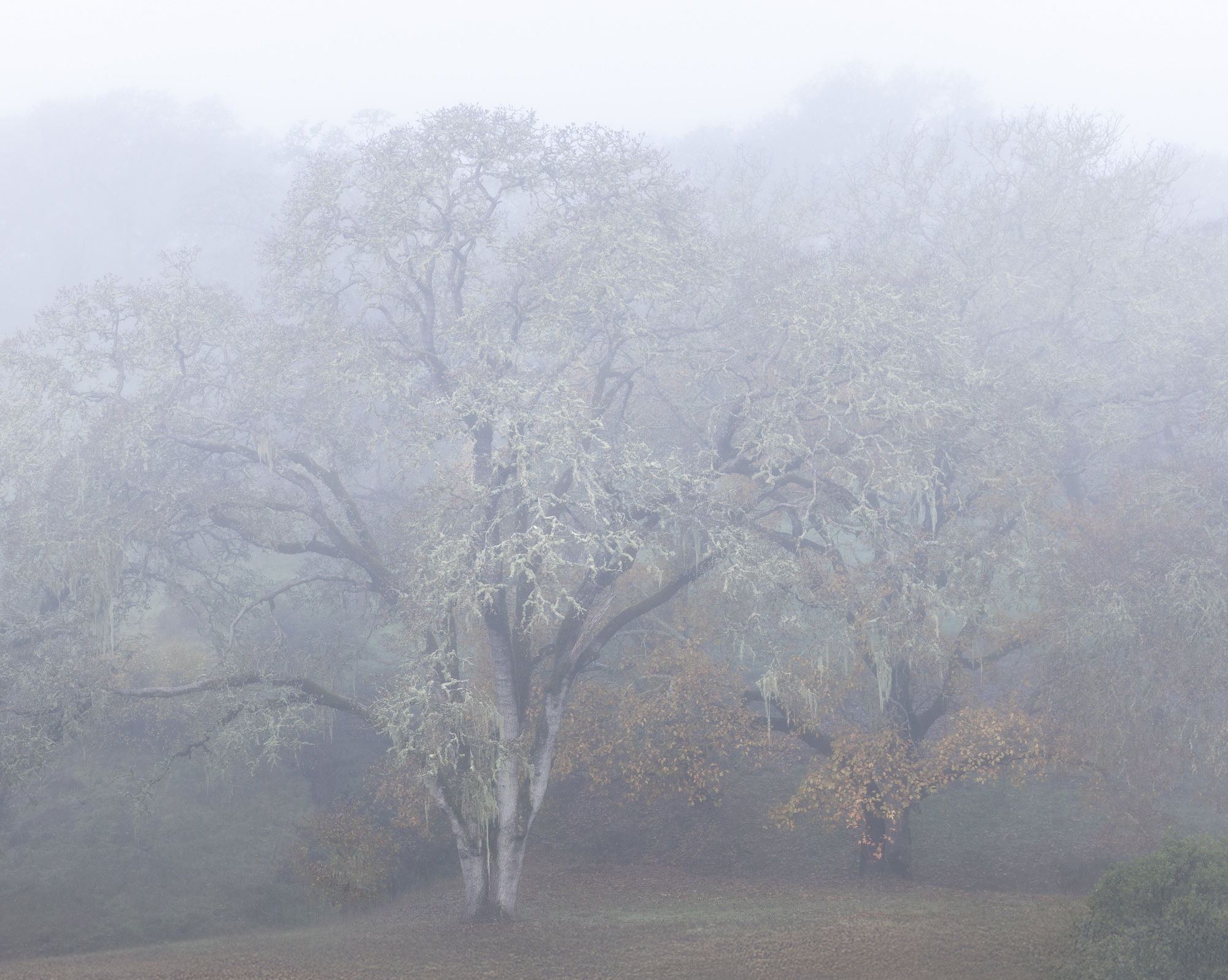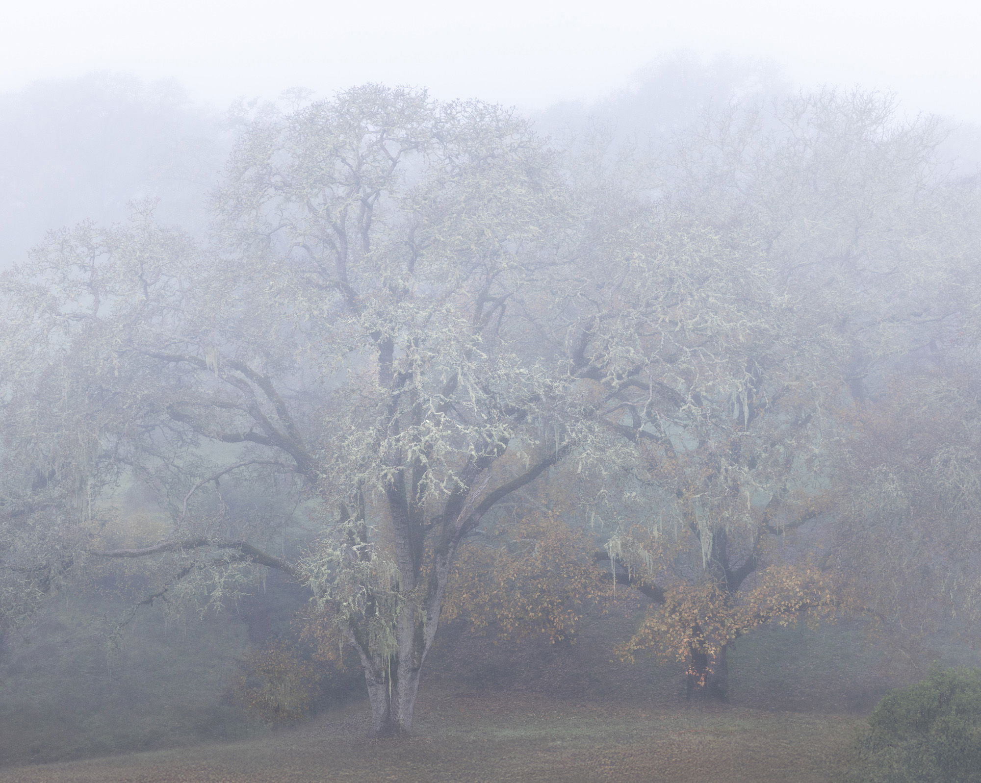 This image is absolutely gorgeous and dripping with mood; I can see why these oaks are your favorite trees. I would be in heaven if we had some major fog for a couple of weeks. I am loving the lichen on the branches and the white areas on the trunk do not bother me at all as I feel it compliments the atmospherics beautifully. Your tweak is subtle, but I do like it. I think you could also get a pano crop out of this focusing on those lichen covered limbs; a twofer if you will. Beautifully done!