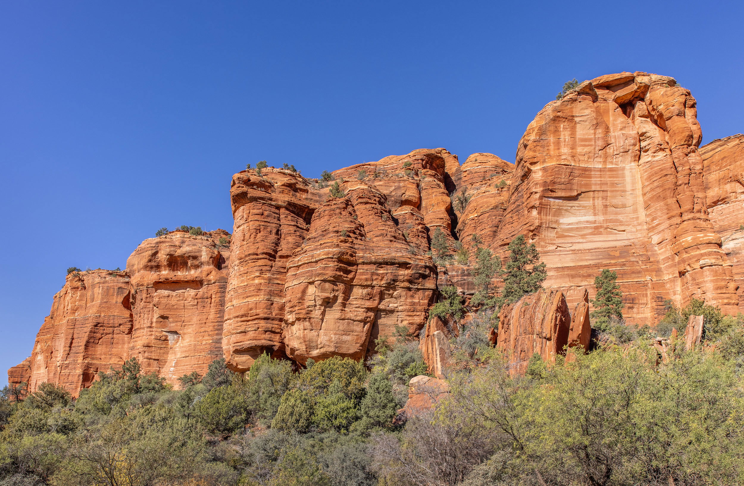 I didn’t get anything but snapshots of the Palataki dwelling ruins NW of Sedona, but as we walked in this cliff face was pretty impressive. I think the dwellings were just off to the right. Possibly the area of petroglyphs and pictograms is under the overhang you can see just left of center. The dwellings were just a couple of crumbling stonework walls under a big overhang in the looming cliff wall. The trail to them is uphill through brush and trees so you don’t see them until you’re about 20 ft in front of them, and you can only stand right in front of them to hear a ranger presentation, then back down the trail and up a different one to the petroglyphs and pictograms, which is a grotto under an impressive overhang.