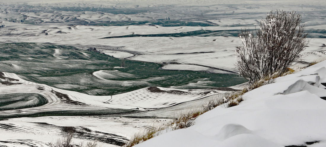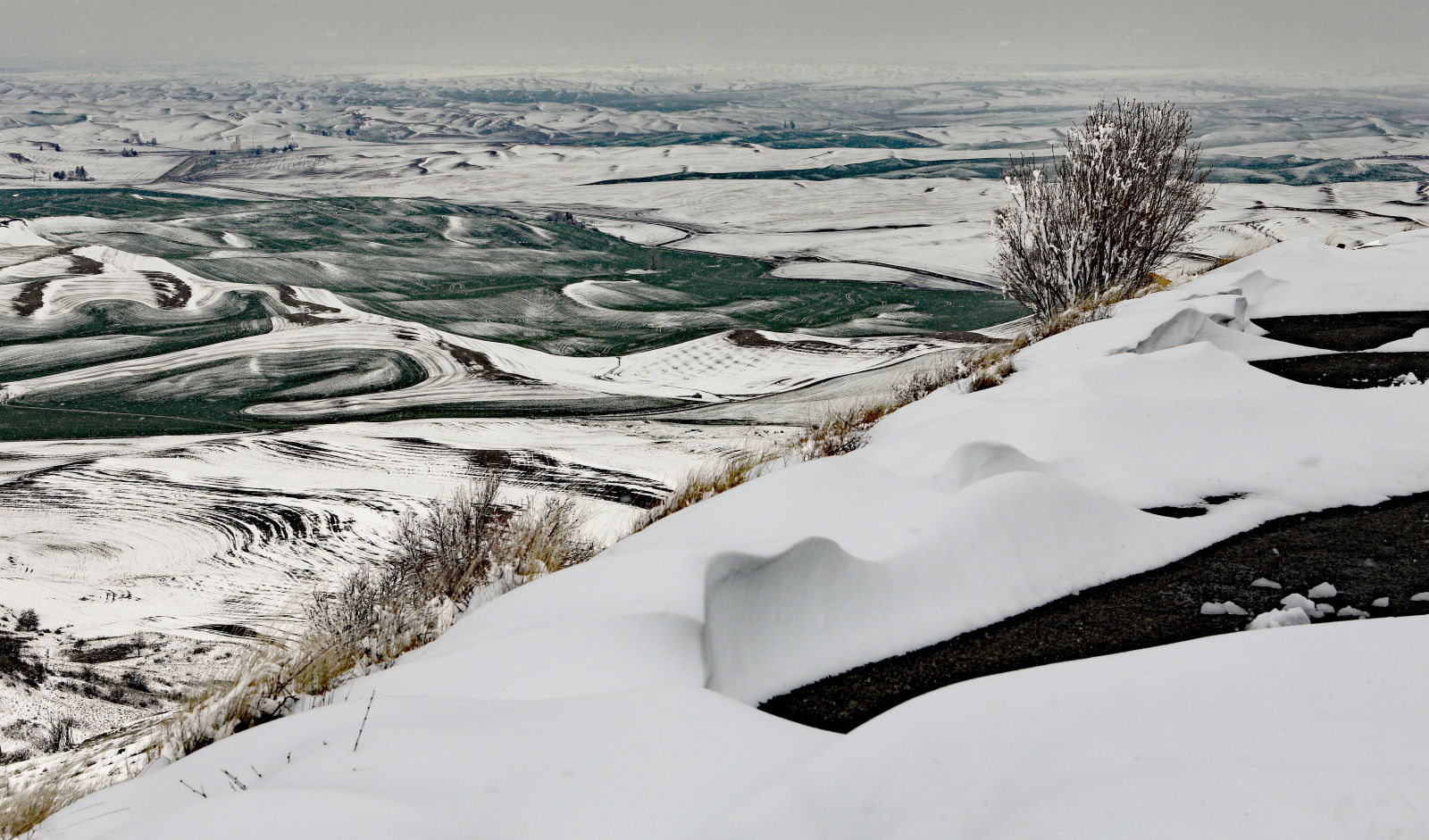 We decided to take a day trip to Steptoe Butte last Friday. I was looking forward to the early spring colors. Some snow on tops of hills at Colfax. Closer we got to Steptoe; more snow and started snowing. We were the only ones at the butte. Drove up through quite a bit of snow and some drifts (probably not the wisest move with no one else there). The higher we got, the foggier it got. Took several photos. Made for a B/W environment. I’ll post some others later. I found getting good images was difficult. I would like to have remained until later in the day when the snow melted and it got brighter, but we had to get back home.