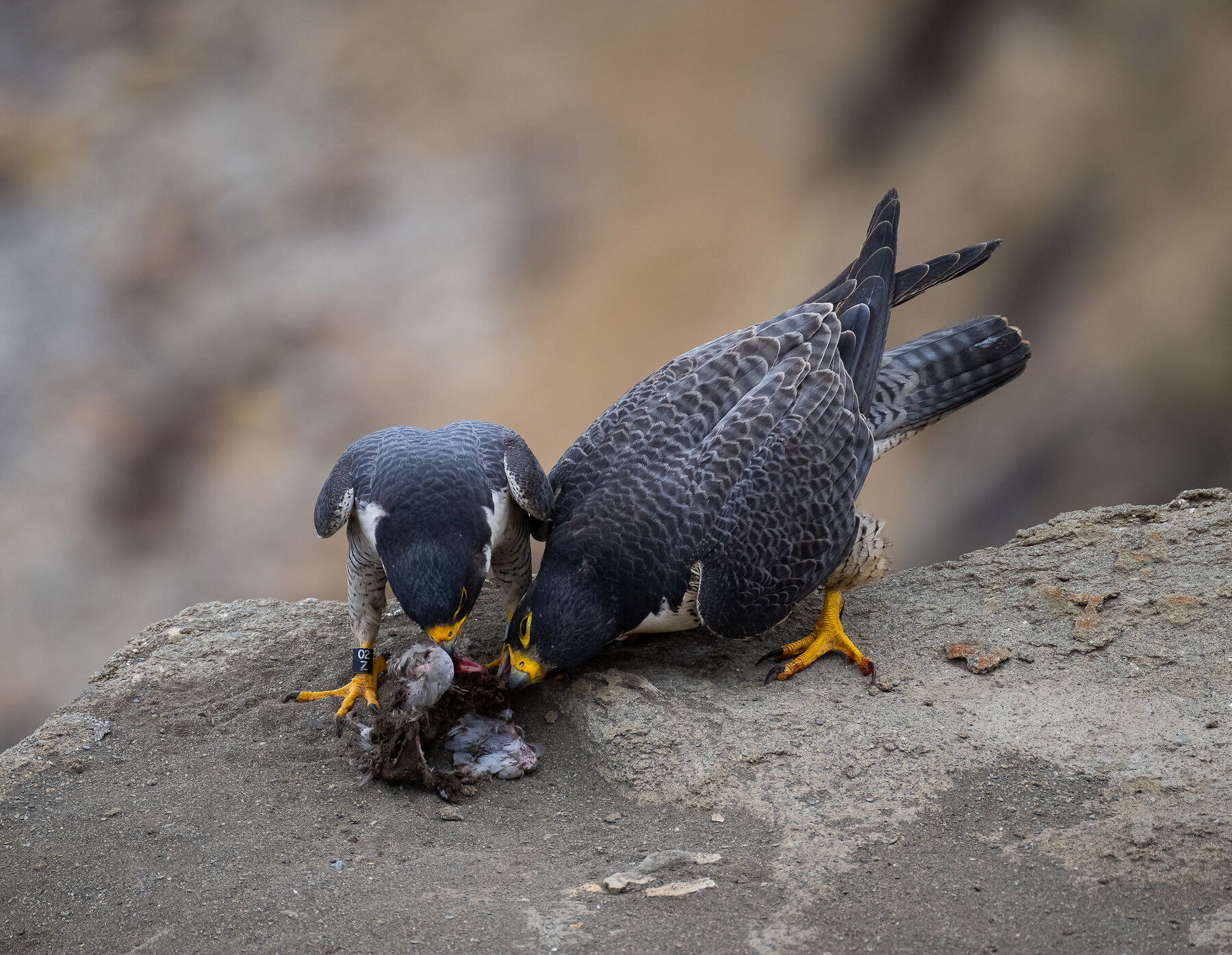 Thanks for stopping by to take a look. I added a second image to show the size comparison between an adult male and adult female Peregrine. It’s substantial. This particular male is banded. He is a very proficient hunter bringing in plenty of food for the three juvis and the female. Here, he has brought in some leftovers to give to the female.