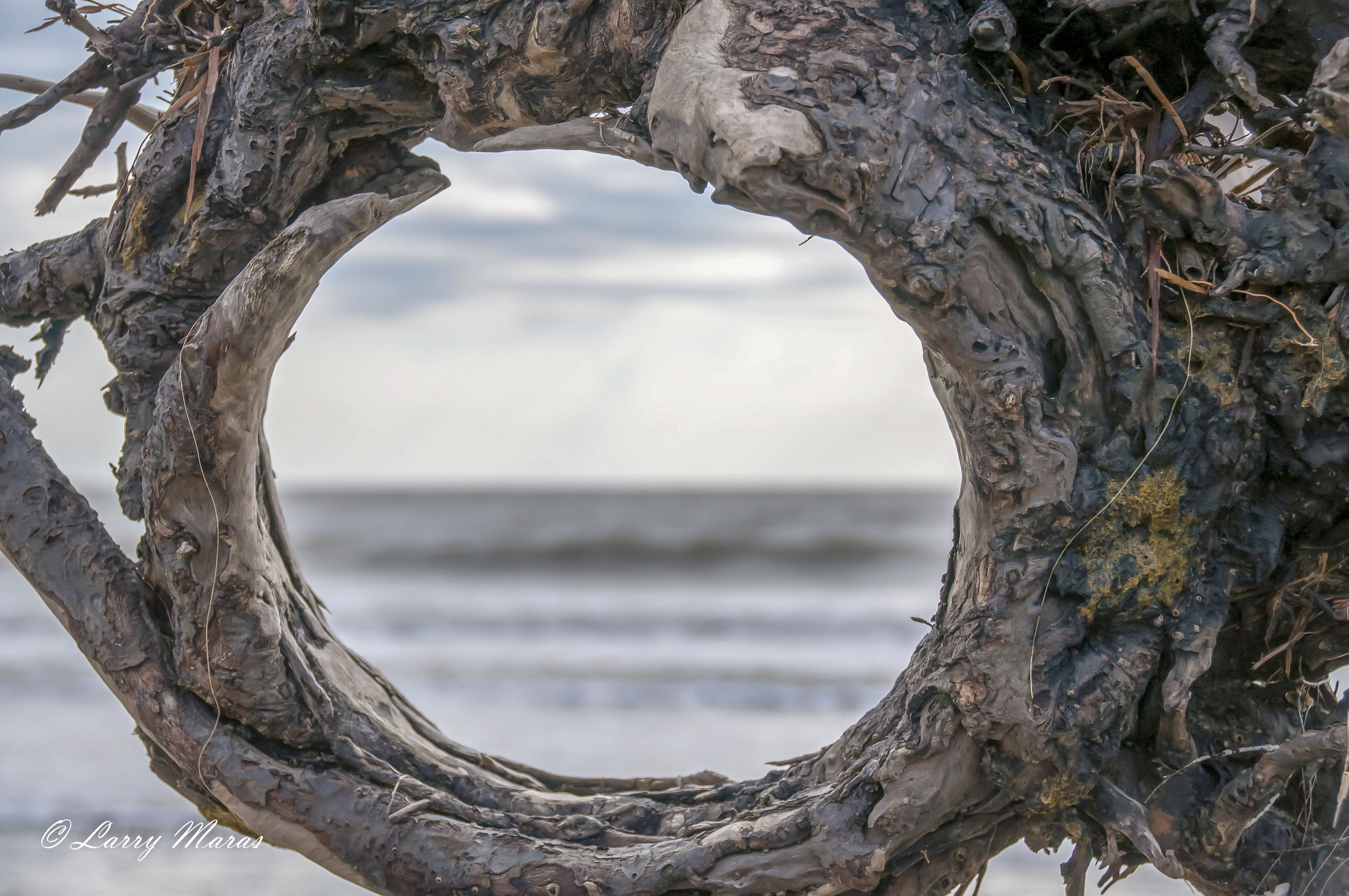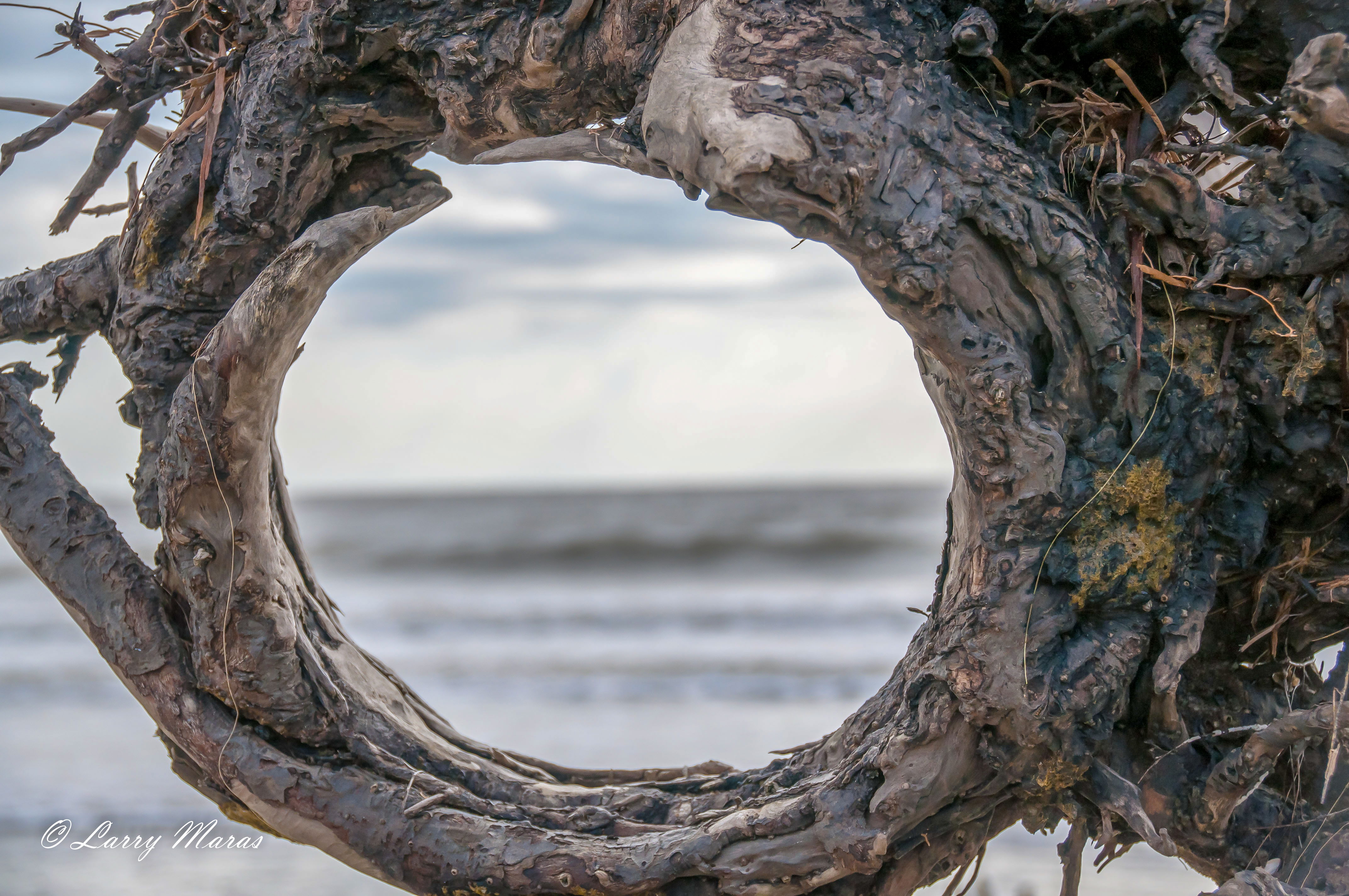 Larry, a great find and appropriate title - once could also say, “A windows to the world…” or something like that. I like the selective focus and dof, keeping the details in the unique tree, root ball or whatever it is… and there’s enough depth to recognize the ocean, waves and sky, but soft enough to keep the focus up front. Good job on the processing. the only small suggestion would be a CW rotation as the horizon line looks a little slanted.