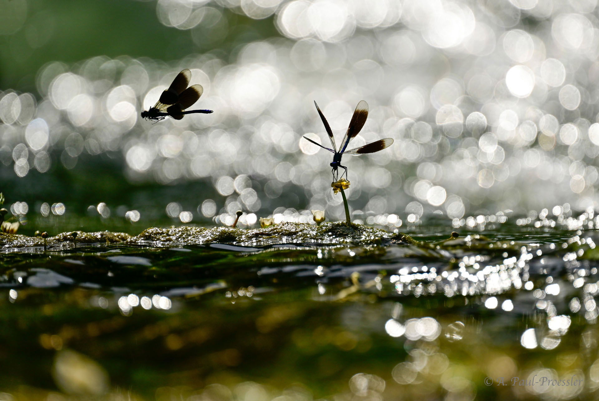 Prachtlibellen (Demoiselle?) in front of a small cascade. Sunny days, even with high sun, are good for dragon-flies. I wanted to have a shallow depth of field IOT get the bubbles from the water spray. To get both dragon-flies in the focus area is a challenge.