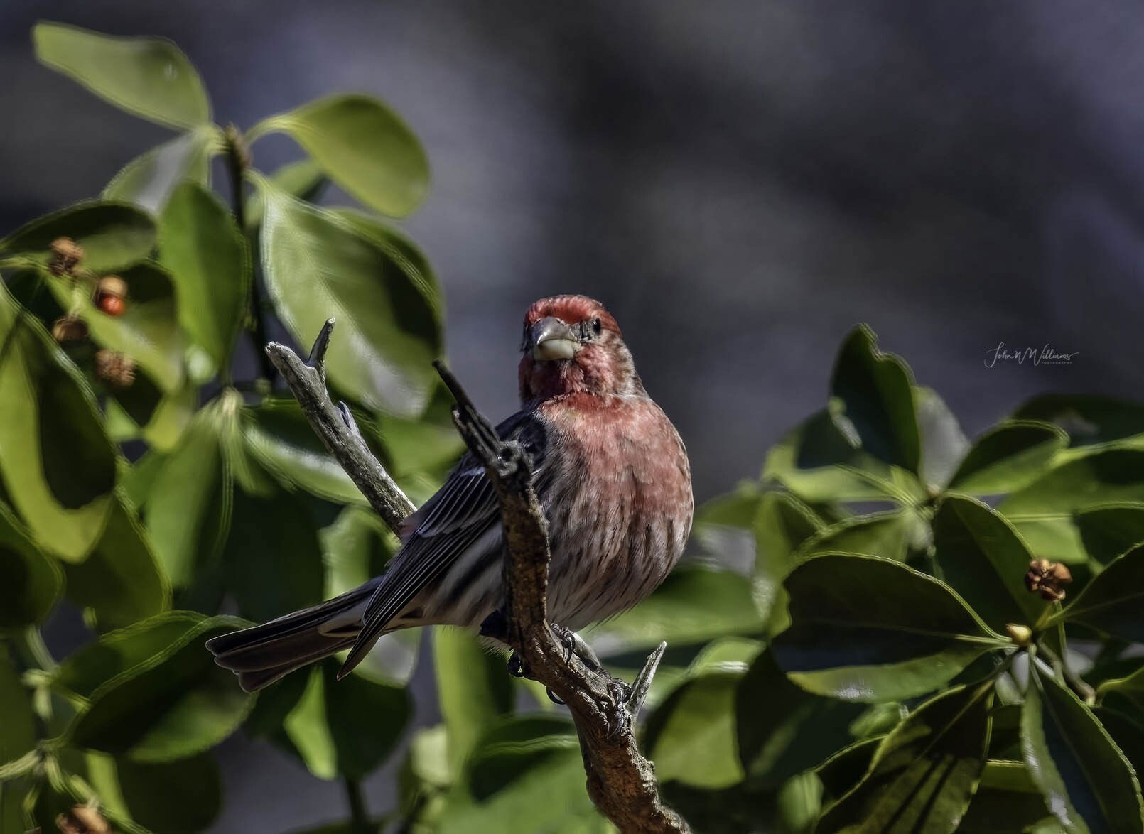 Nice pose, though a slight head turn to its right might be better. Good detail and I like the perch and the surrounding foliage contrast well with the finch. I do find, though, the background to be a bit distracting.
