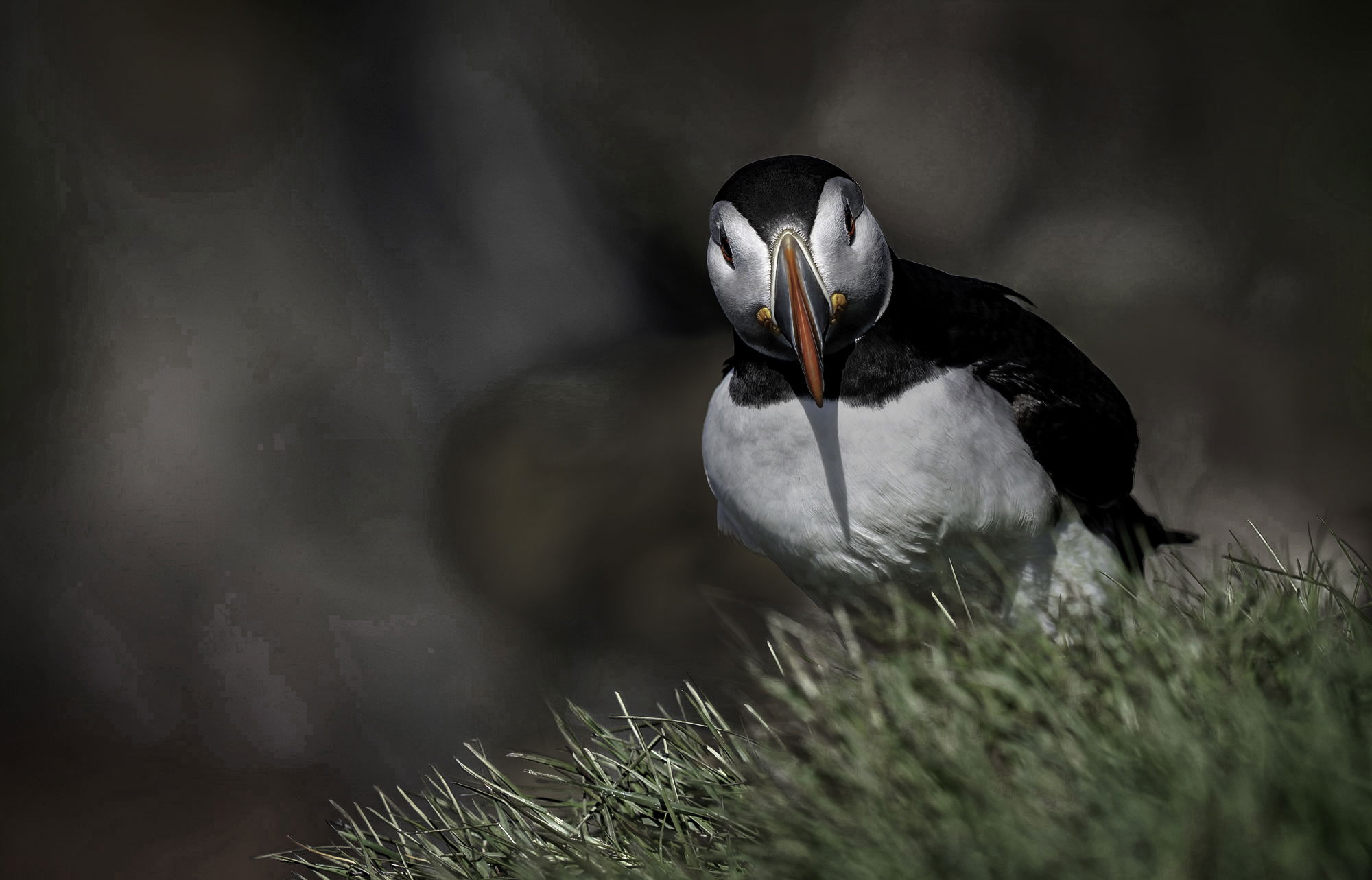 Beautiful lighting and a great pose in this one, David. I can’t recall whether you do much LR processing, but if you do you could select that yellow area to the left of the puffin and use the point color tool to desaturate and darken it a bit. It’s just yellow enough to draw my eye past the puffin.