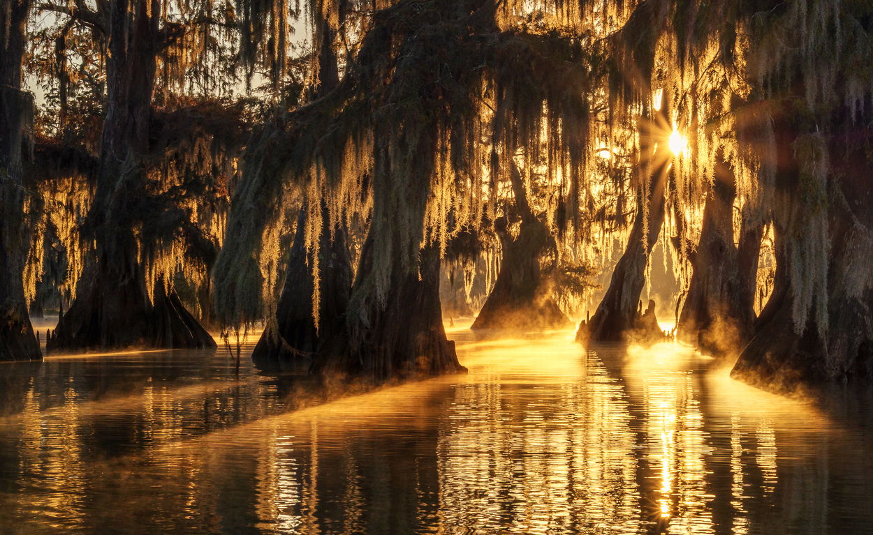 I have to agree with everyone else that this is wonderful bayou scene you captured. I quite like the mood created with the rising sun piercing through mist and bathing the scene in this warm glow. I especially like the backlight on some of those hanging mosses. My only suggestion is to print it big and find a wall to hang it. Very nicely done.