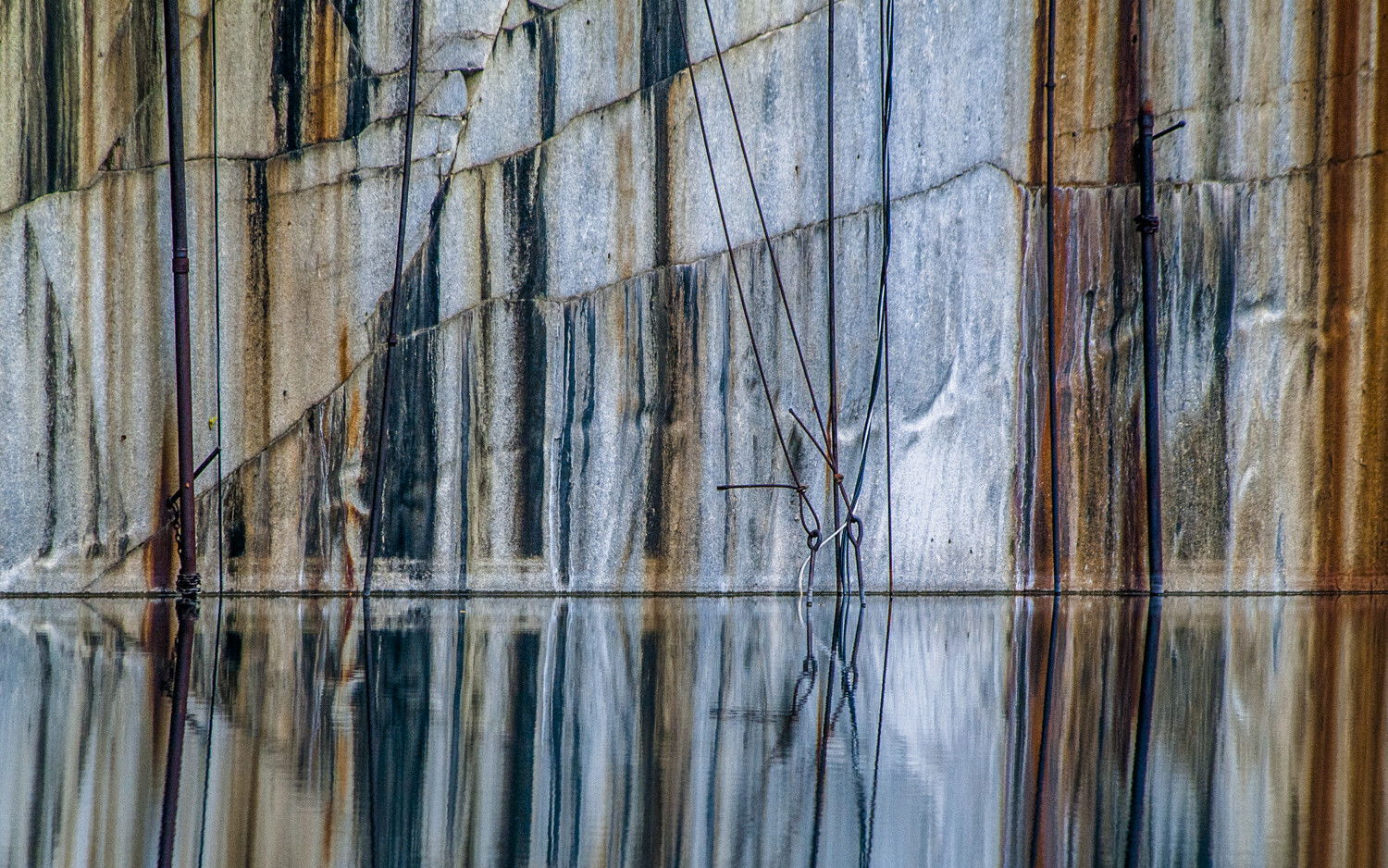 One of the big quarries of Rock of Ages in Barre, Vermont, is typically full of water. It is huge. The remains of cabling sets off the stained granite and all is beautifully reflected as an abstract form.