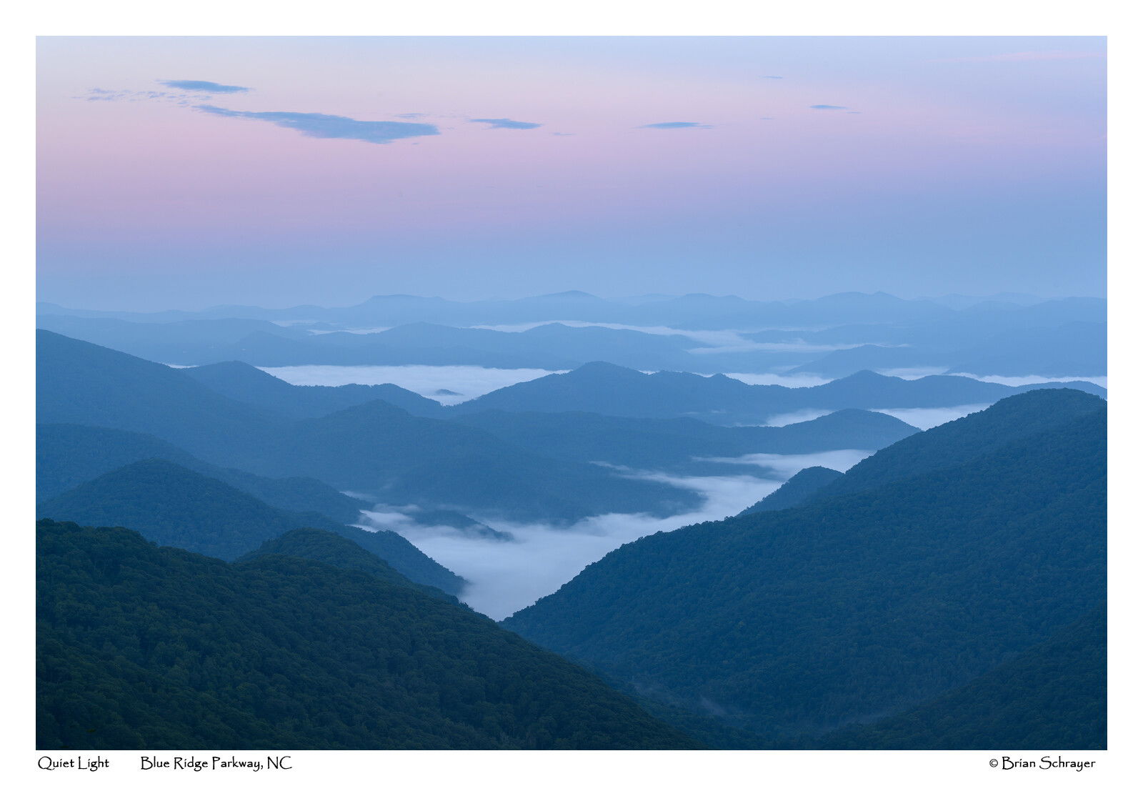 This is an image that I took last year at sunrise along the Blue Ridge Parkway. The sun was rising over my left shoulder and was partially diffused as I remember. The result was this soft pastel glow that I thought had a quiet beauty. The fog accentuated the layered ridges and matched the mood of the photo.
