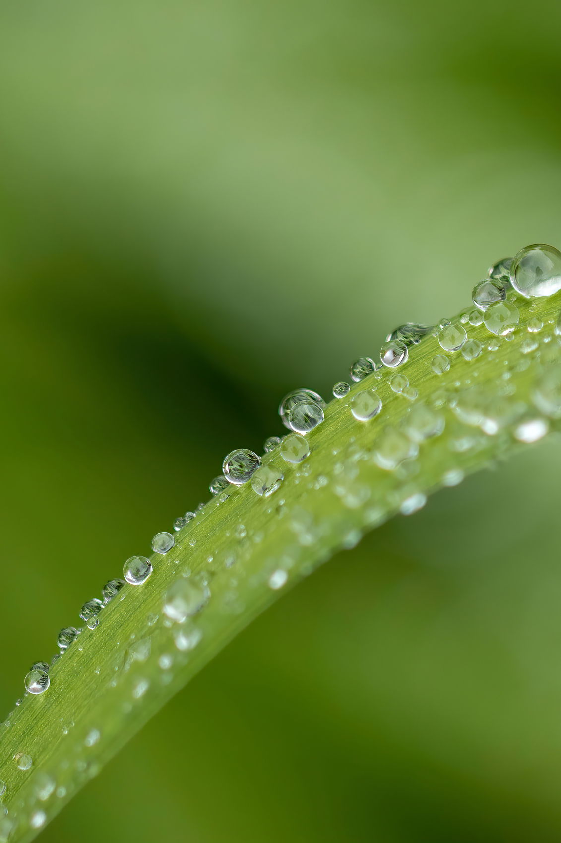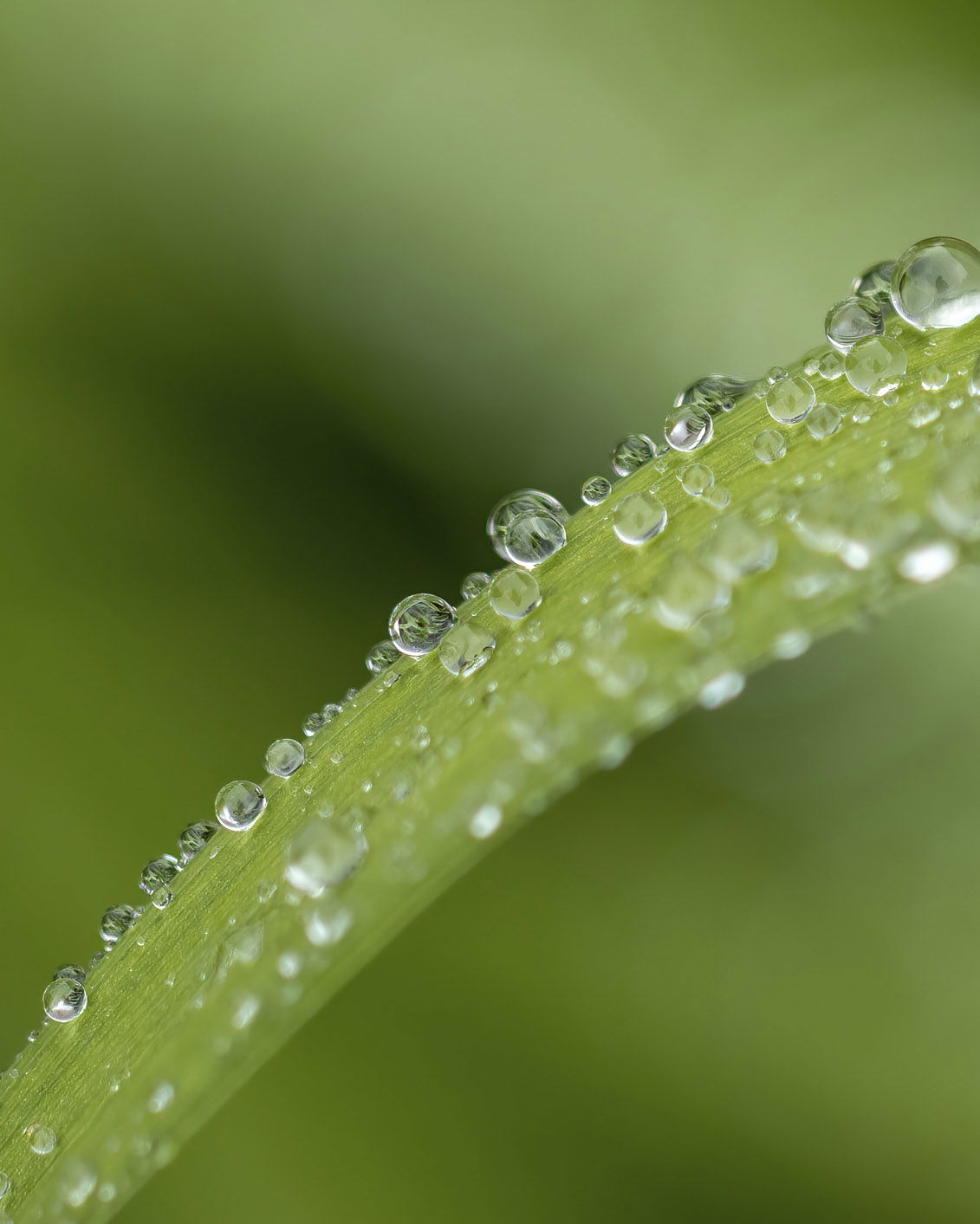 Tom, welcome to NPN and the Weekly Challenge. You’ve got a great array of drops on the leaf arching across the frame here. Having the sharp ones show the green and dark tones behind add well to the view. In the large view, the details and how they change across the frame add so extra interest. Yes, the “extra” background at the top is not adding anything, so cropping to 4x5. You don’t say what your aperature was so I wonder if the front drops could be a bit less diffuse, but that’s me and I have a penchant for depth throughout… The other thing you could do to lessen the interest in the foreground drops would be some burning-in of the brightest tones along the front.