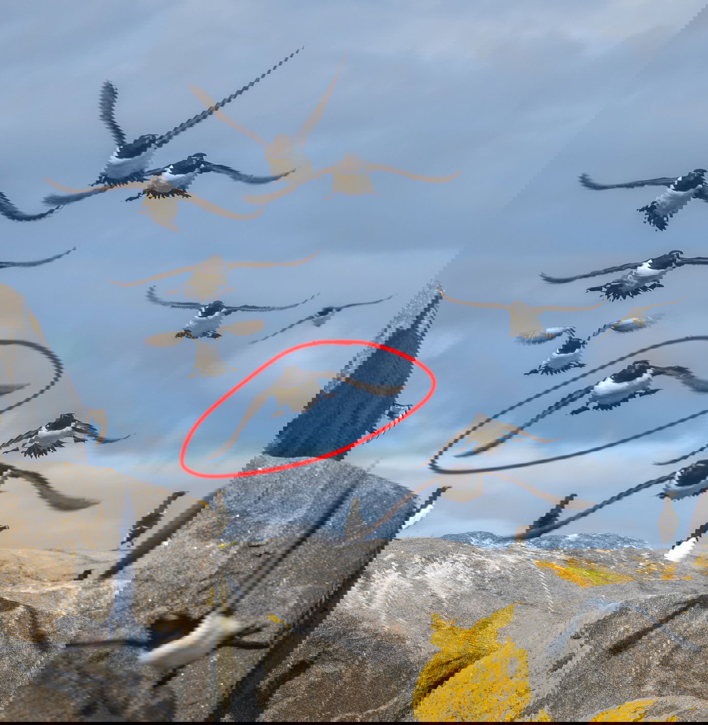 The composition has a lot of impact, Ryan with the appearance that the Razorbills are flying straight at you. The one weakness I see in the image is that the bird that my eyes go to first (circled in red below) is not in crisp focus and it have to look up in the frame to get one that is in focus. You don’t mention your aperture or shutter speed, but if you had enough light, stopping down quite a bit might have put more birds in crisp focus. Alternatively, setting manual focus at a distance that would put a bird reasonably large in the frame and just blasting away as they flew at you might have given you more choice in composition.