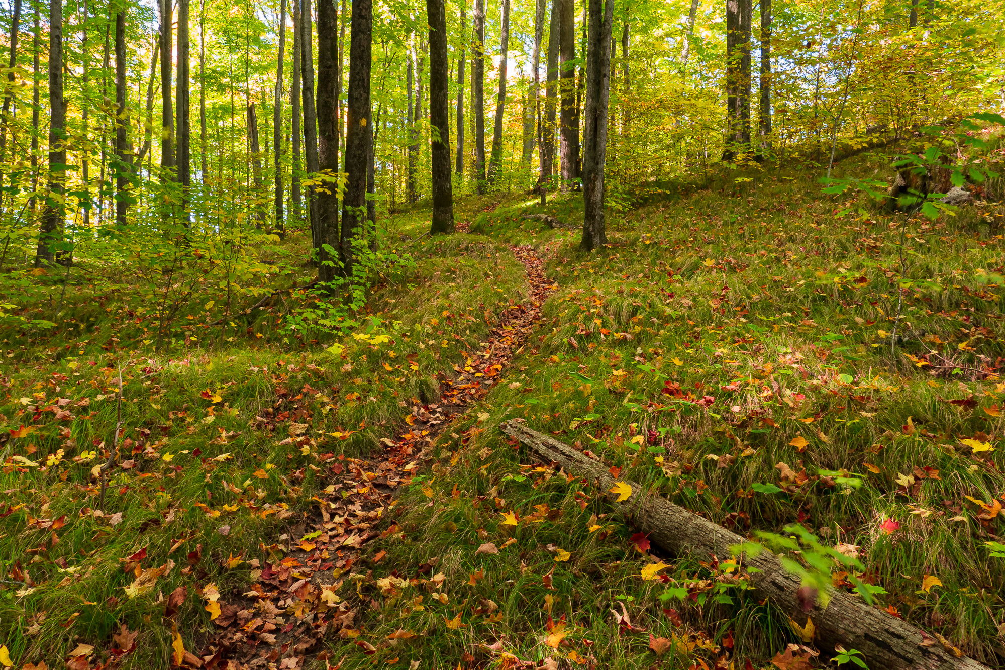 There are little lakes and ponds dotted throughout the trail and they are amazing with color and reflections, but for me the forest holds the key. My favorite time in fall is when there is still green in the undergrowth and I do my best to bring that to bear in my photos. This is one of my favorites. I wanted to present dappled sunlight and the way open space ahead or at least the idea of open space can create an inviting image. Totally overcast skies don’t help create depth the way direct sunlight does in the forest. The waving little maple in the lower right just speaks to me as does the hill and the atmosphere of joy I feel when I look at this shot and remember.