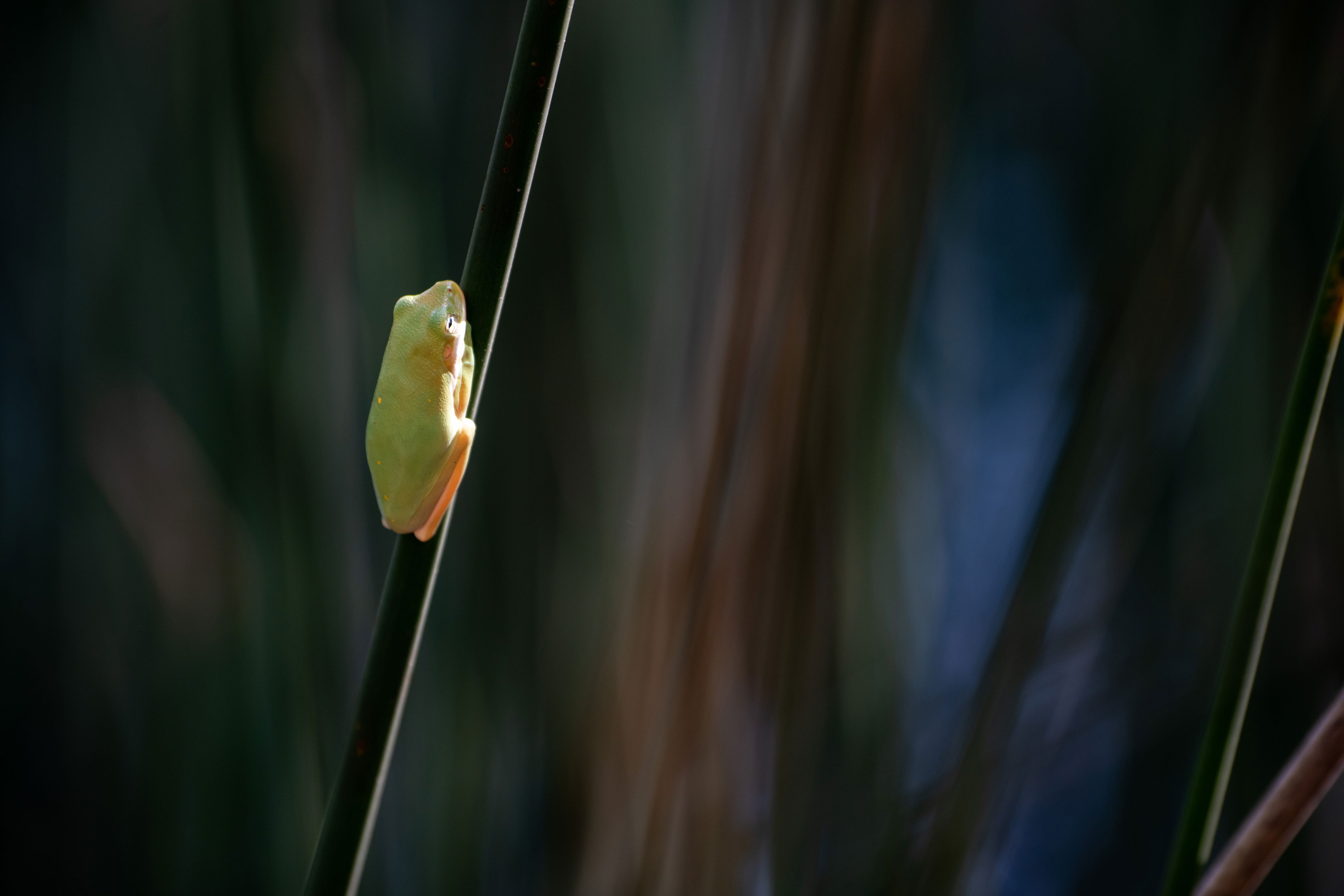 I found a small pond at the Lewisville Lake Environmental Learning Area. On the cattails were various green tree frogs in repose. Correct, the subject isn’t filling the frame. I believe the tapestry of blurred plants as background is an important setting or stage for the amphibian in question and is an integral part of the whole composition.