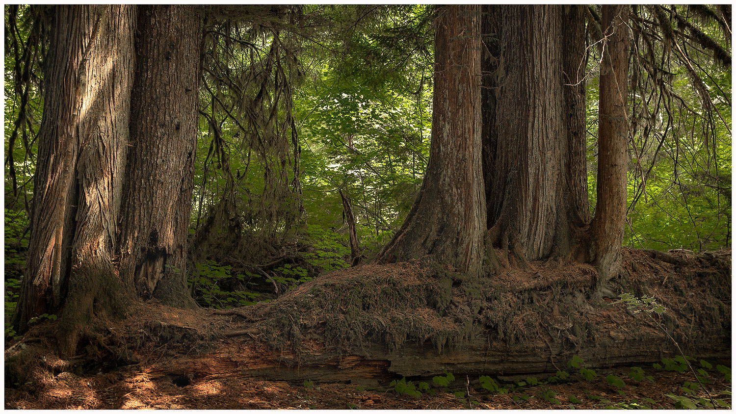 In an old growth forest, a fallen stump from a dead tree can provide the nutrients to allow for new growth to thrive. Seen here are several trees that have taken root in this “nurse log”, and over many years have grown quite large. It is easy to get lost and feel very small among these giants of nature.