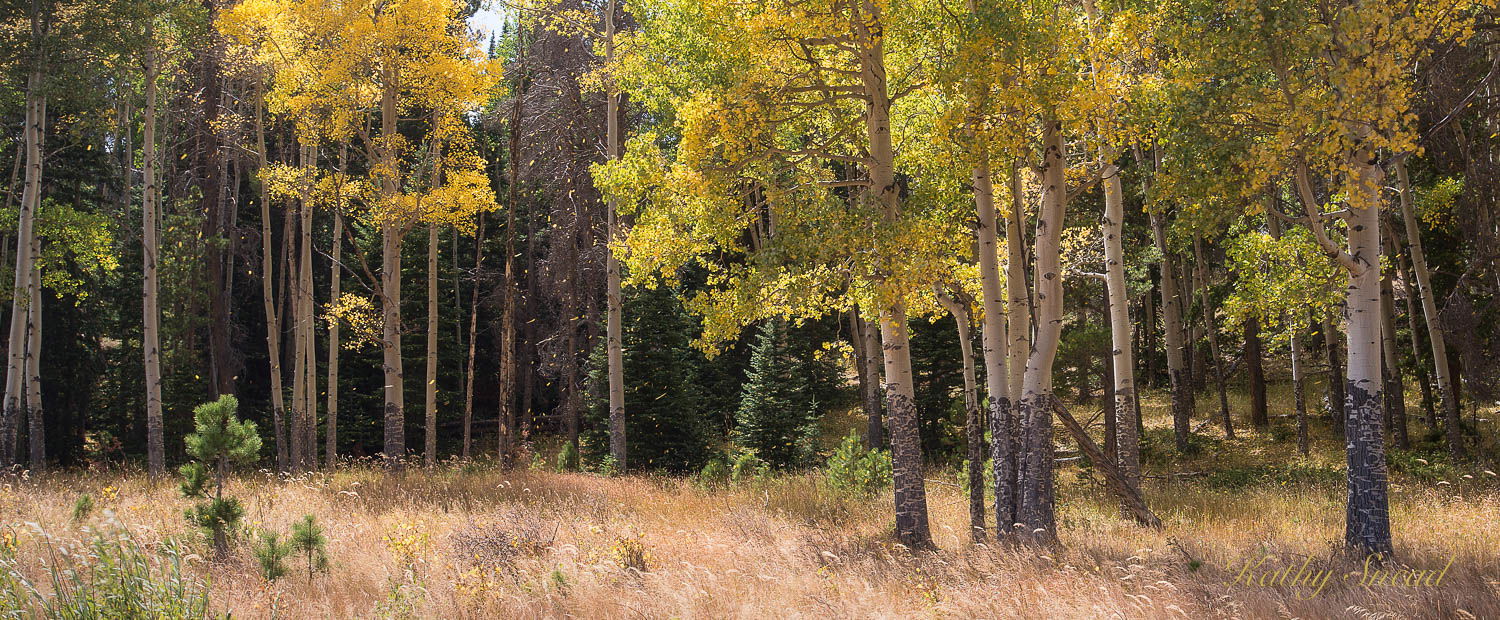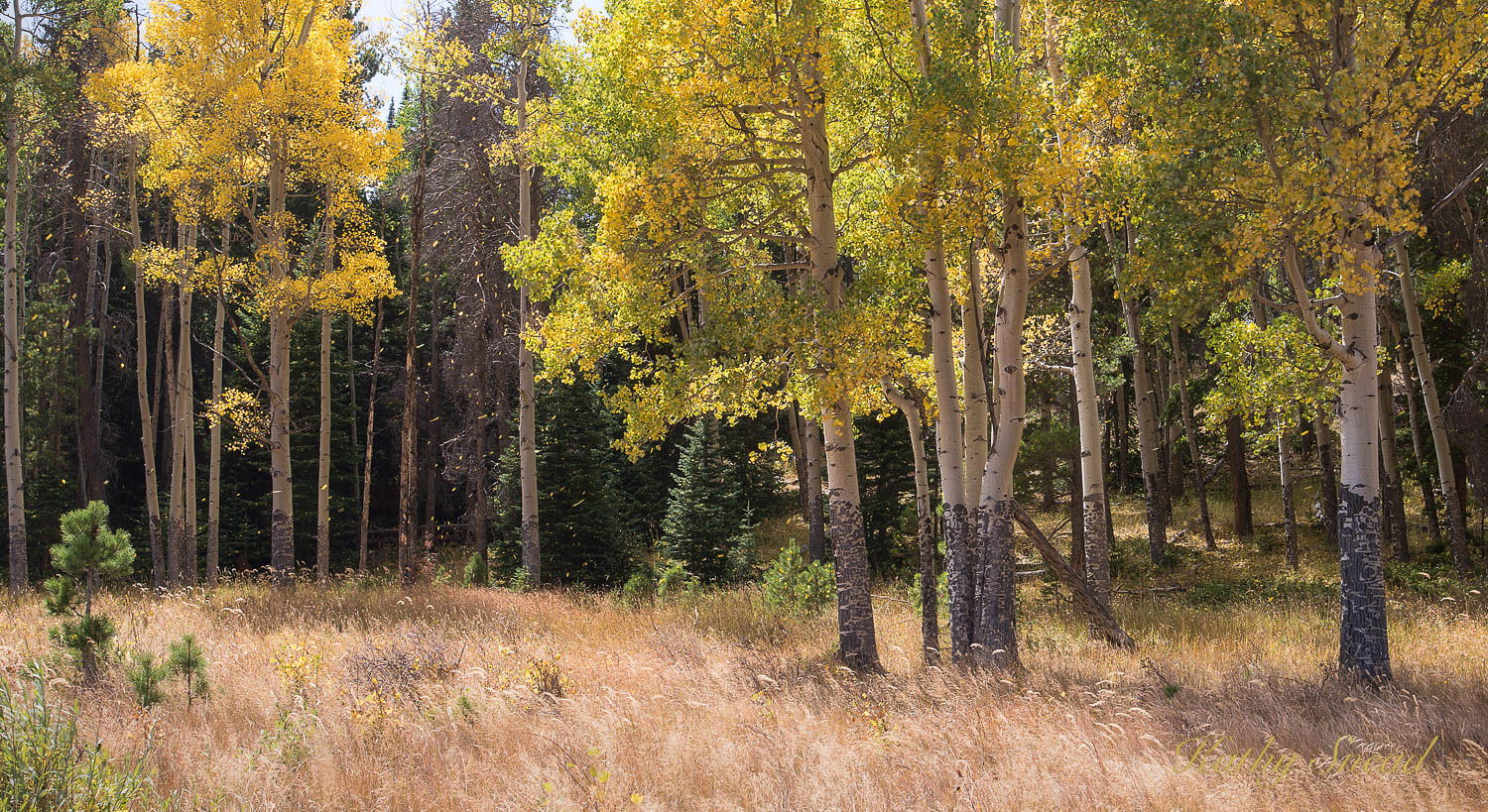 Although the patches of sky do draw the eye a bit, they don’t bother me, given the time of day and the back lit aspen. In fact, you chose the best angle in showcasing the back lighting.