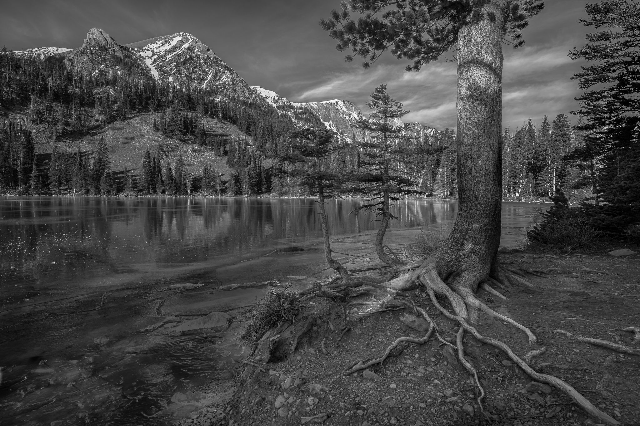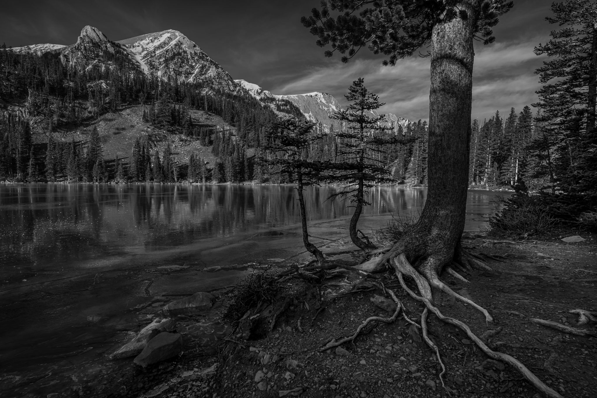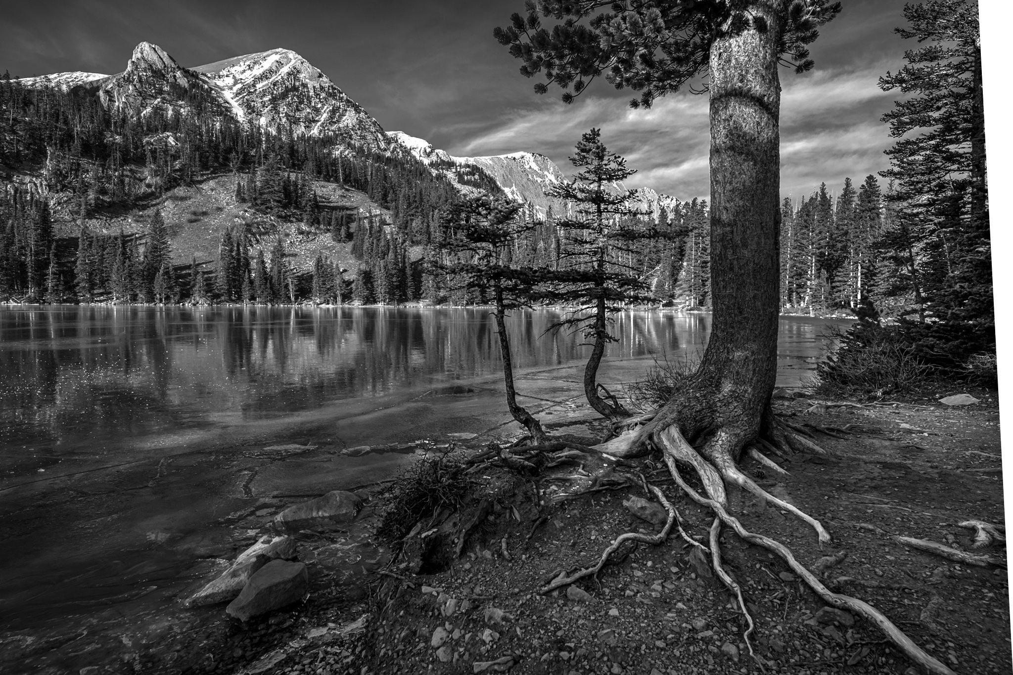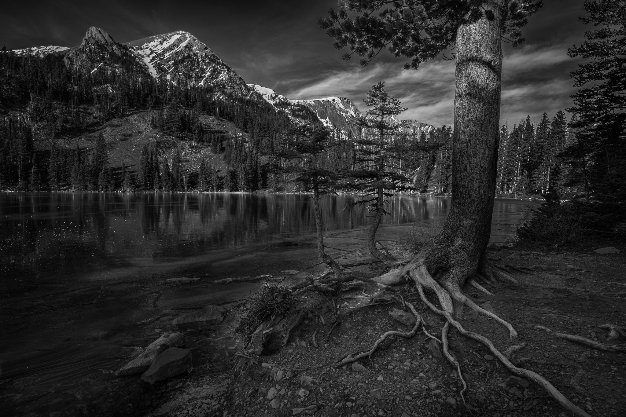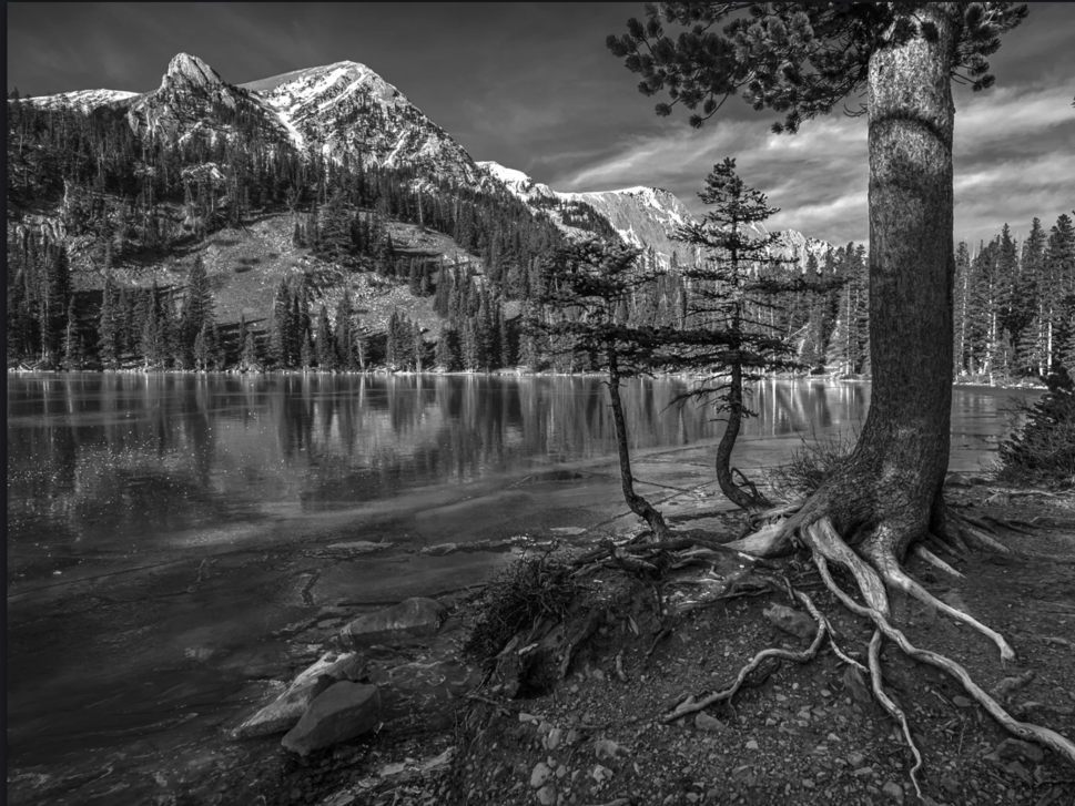 @Youssef_Ismail@Michael_Lowe@Gill_Vanderlip@Tony_Siciliano@Preston_Birdwell@Diane_Miller@Bill_Fach@Marylynne_Diggs@Igor_Doncov@Bret_Edge Ok, I had a go at lightening up the scene a bit. My personal preference is B&W is towards the darker side, but I do agree this one needed some help. I actually like leaning trees, but the dark trunk right at the right edge was distracting so I used the liquify filter to move it off the edge. If you see the unprocessed image above, you can see how shaded the foreground was. I exposed for the bright snow on the mountains but in the process probably lost some detail in the foreground. Anyway, Lightroom’s masking tool to the rescue! I added the new version at the top.