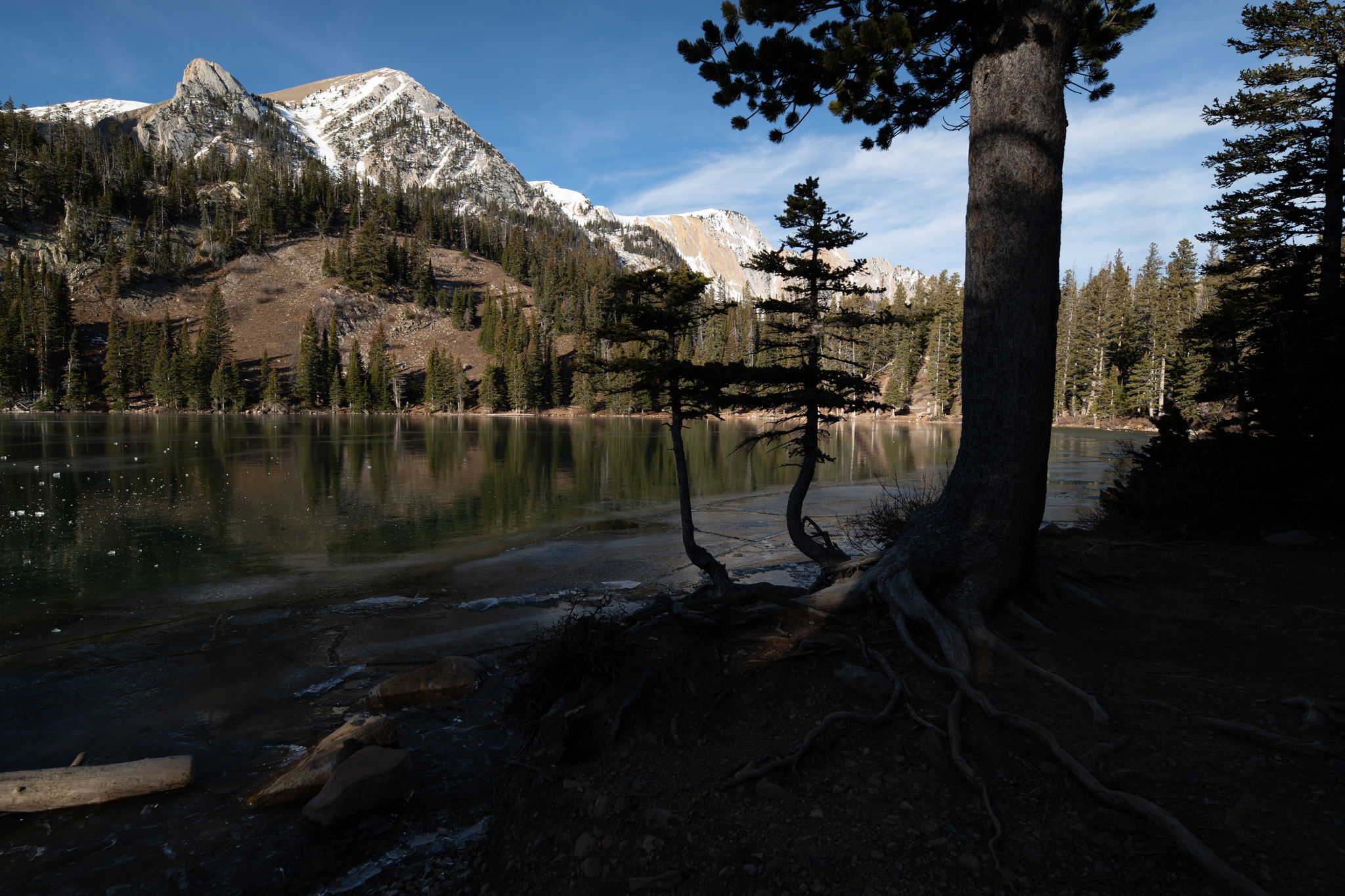 Wind is an imaginative creator that uses a harsh medium to produce grand works of art. Wind can move soil, carve stone, mold wood and move ice. Here, on the windward side of the lake, trees appear more rugged than their actual age. Their roots work hard to brace against the power of air and the pull of gravity. On this morning, the gentle roar of the wind along with the power of the Sun made the ice sing with deep pops and hollow pings. This was captured November 22 in an area of the Bridger Mountains that should have deep snow by this time. It has since snowed quite a bit and shut down access, so I am glad I went up that morning!