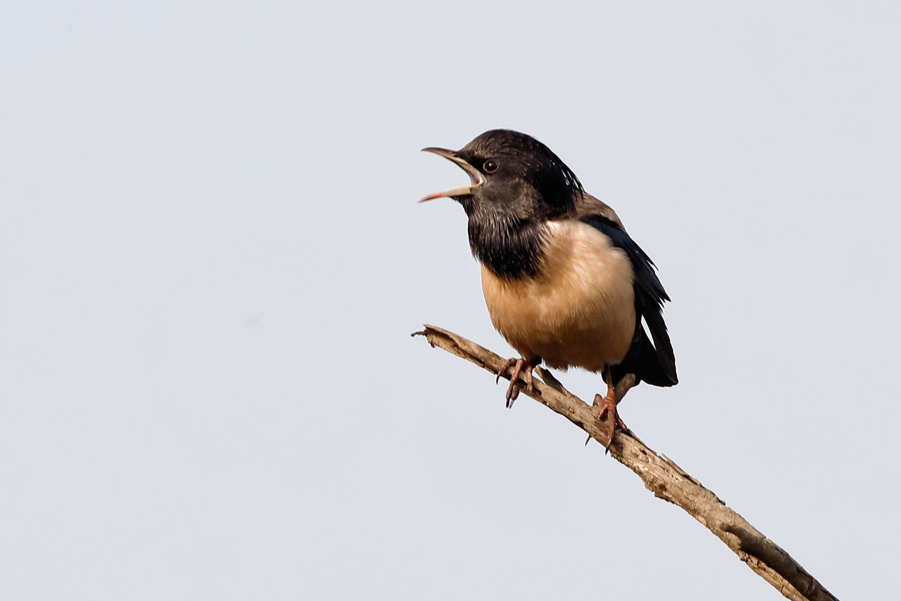 Walking in the woods ..i saw a flock of rosy starlings around the same area. Isolating was difficult, and resulted in this. The fog had lifted off, and there was a fair amount of haze