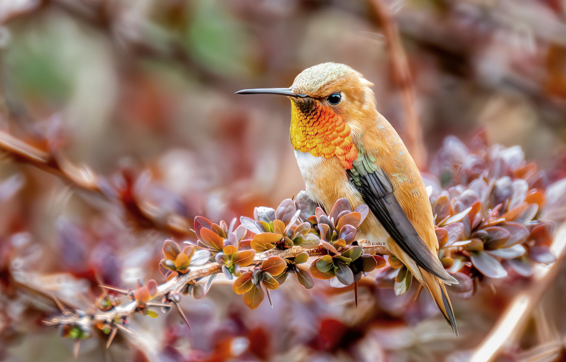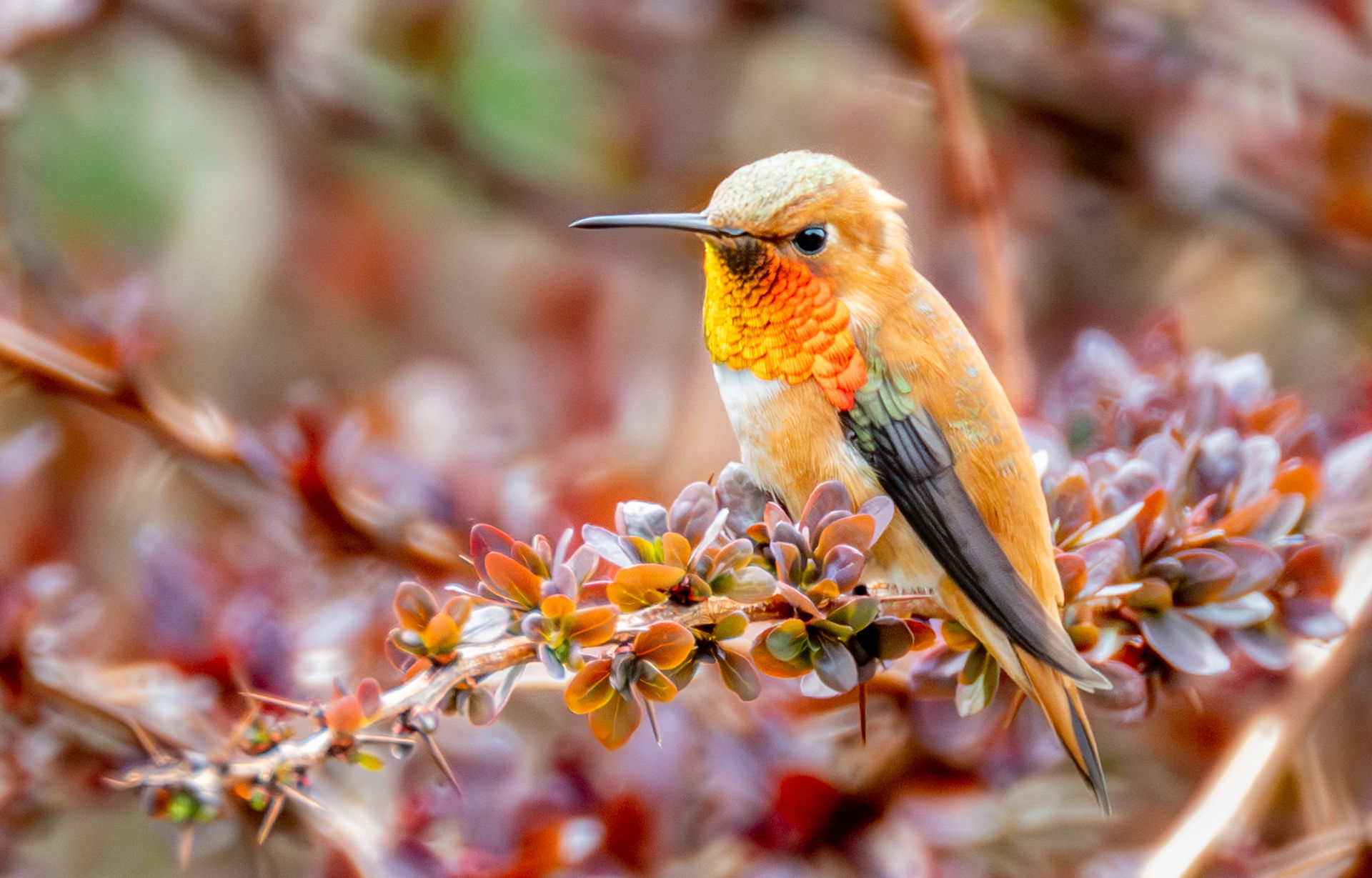 Nice catch and I like the barberry perch, Dan. The gorget is really nice, but the hummingbird seems a bit overexposed to my eye. You might bring down the whole thing a bit and particularly the top of the head that looks pretty washed out.