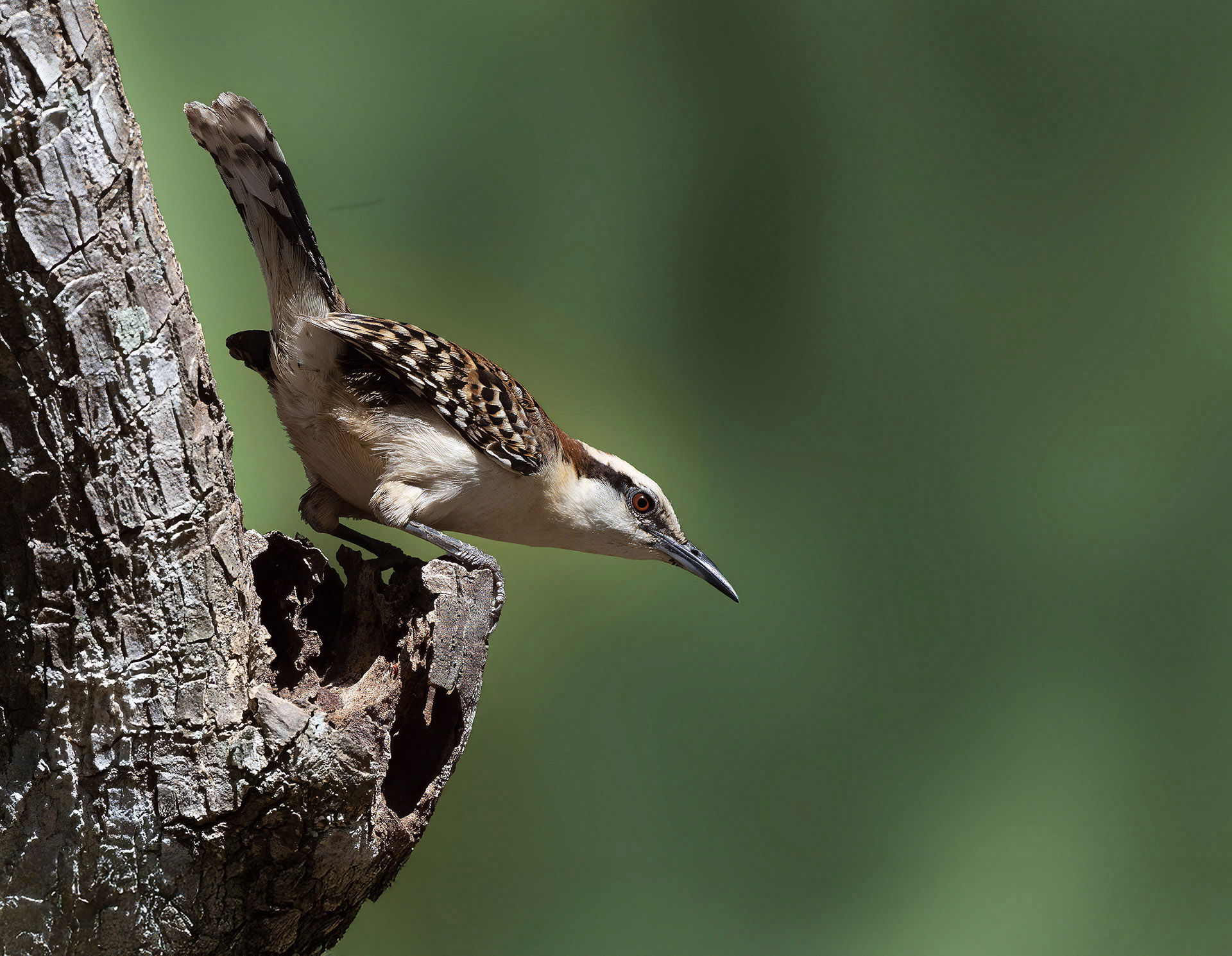 At first I thought this was a woodpecker of some kind, but no…a wren! So dynamic and full of life. I particularly like how the leading foot is curled over the tree bark. The eye is so engaging, too. The immediacy is really enticing. Oh and that butt. So typical of wrens. They just can’t keep that tail still can they? Super job.