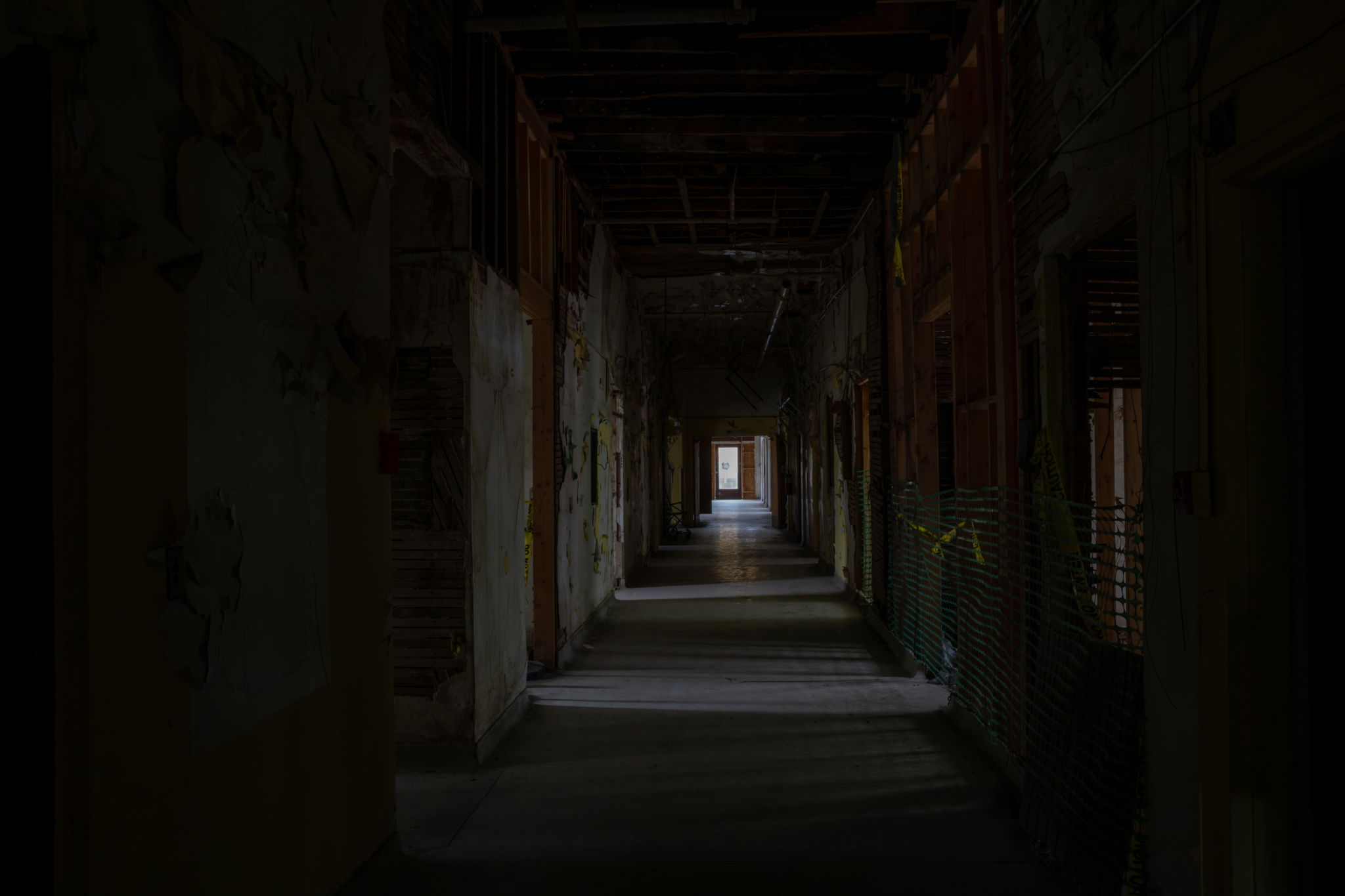 This is the second floor hallway running the length of the building. There are no lights in the building except what comes in the windows, and I wanted to capture that feeling of darkness., while revealing just a hint of detail. Right now, I’m fairly happy with this presentation, but suggestions are more than welcome.