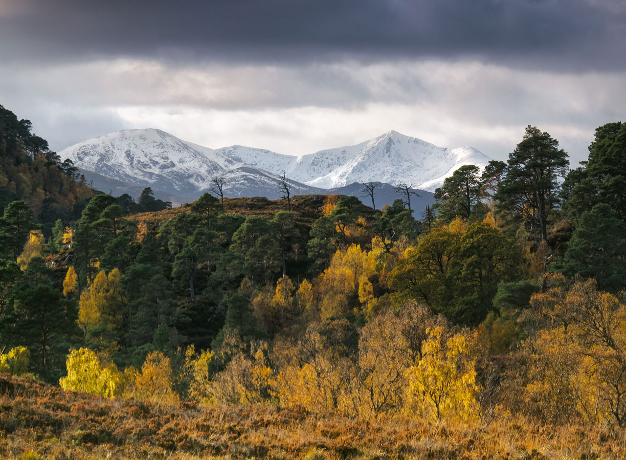 Some of the sweetest conditions you could ask to photograph in terms of landscape photography is during the transitional phase of the seasons. Here the high mountains are receiving their first dose of winter snow providing a monochromatic upper section whilst beneath radiant colour and autumnal sunshine backlights those glorious golden birch and evergreen scots pine trees in the magical glen of Strathfarrar