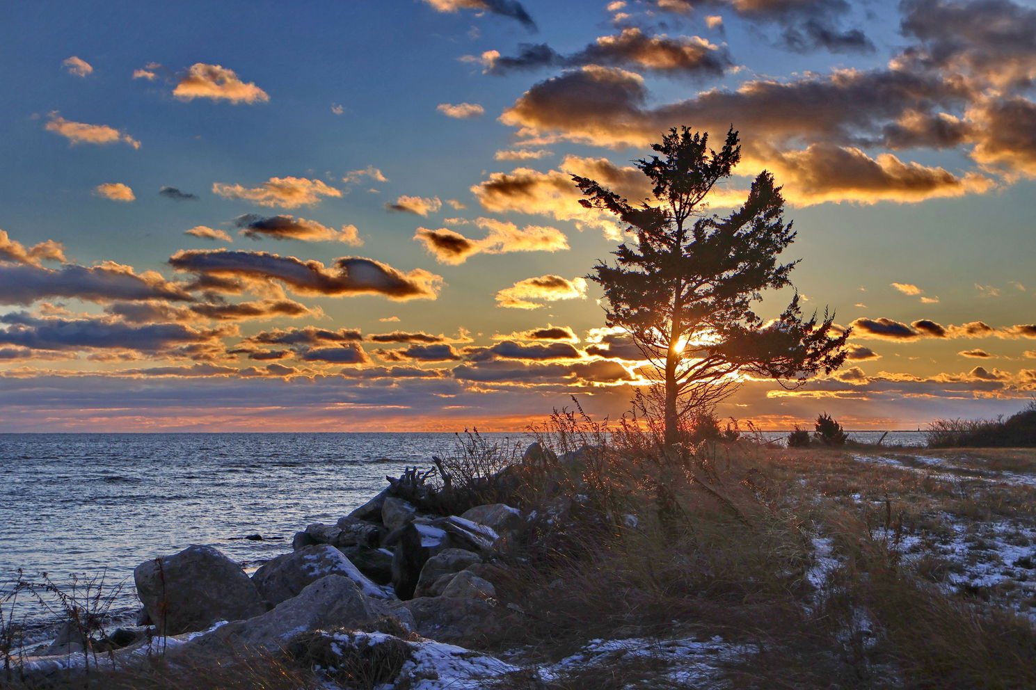 This definitely looks like a cold blustery winter day along the water. The sunstar behind the tree works well and I quite like the subtle highlights on the grasses in front of the tree. I also like the bit of drama with the clouds in the sky. My only suggestion would be the same as @Preston_Birdwell about pulling a little more detail out of the FG and the bush sticking out over the rock on the left. Very nicely done and well worth tweaking a little bit.