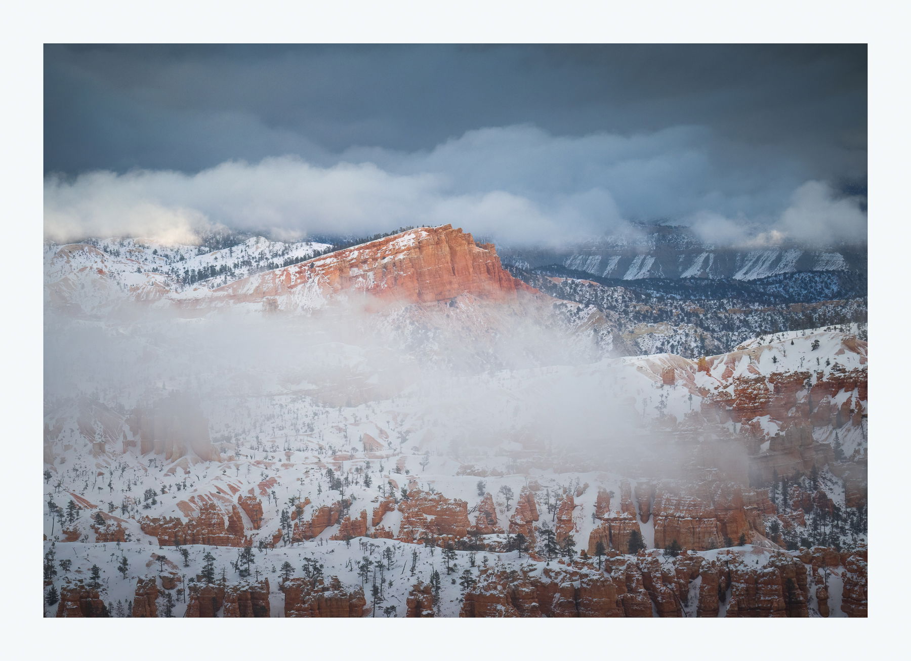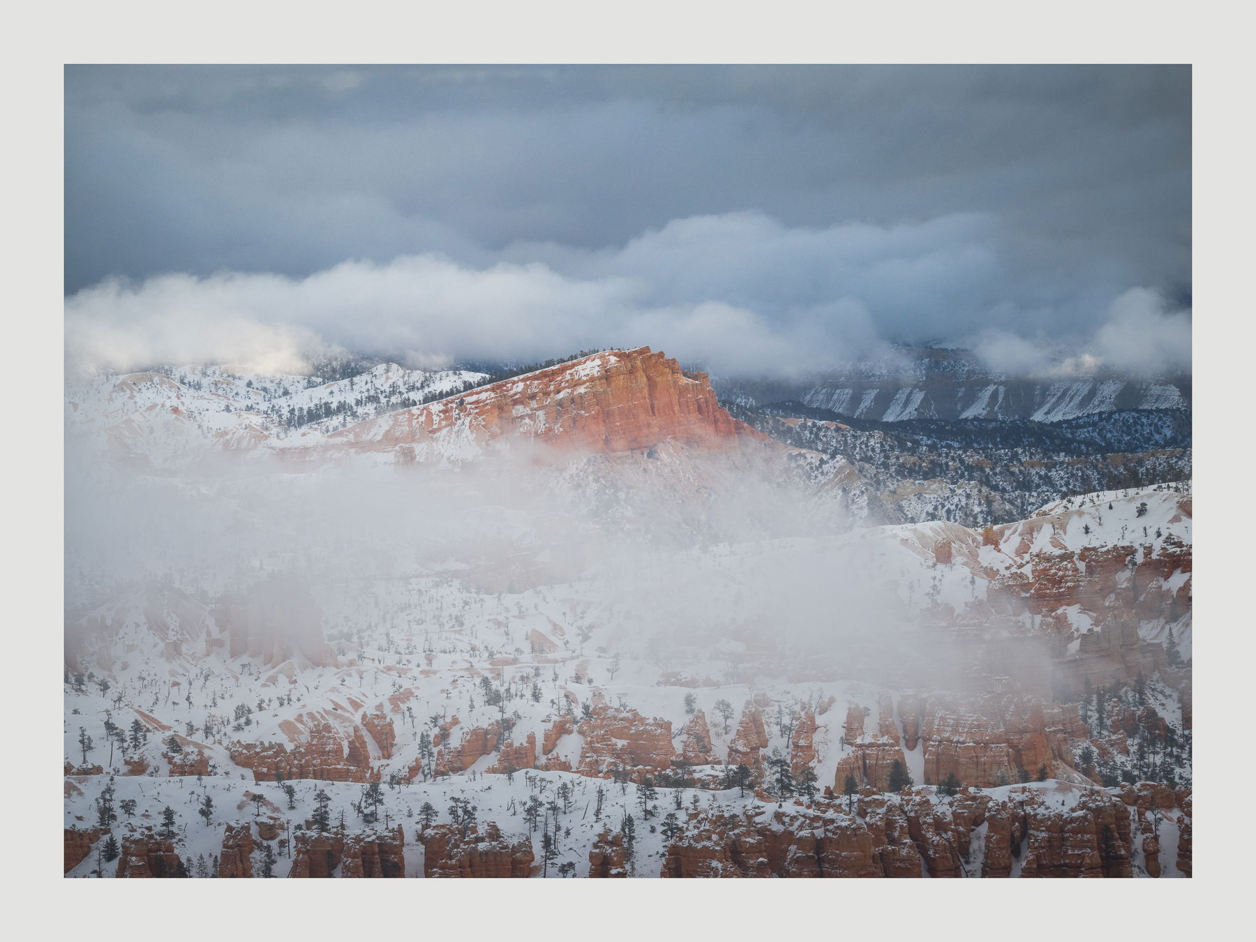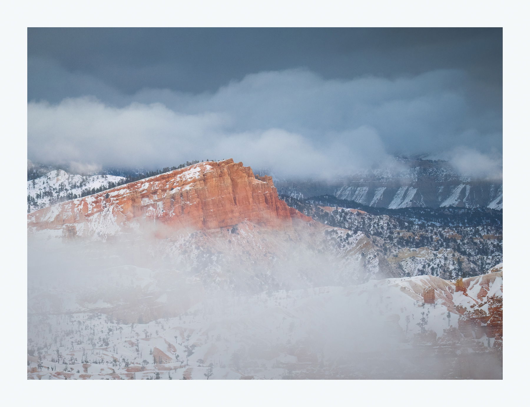 I awoke from a great sleep on my first morning at Bryce Canyon. I was eager to see what the conditions were like so I peaked my head out the door and found about 8 inches of fresh snow on the ground in the parking lot. It was still dark so I had no idea what the cloud cover looked like but it was still snowing softly as I got ready to leave. The roads going into the park were still getting plowed but I was in my truck so it really didn’t matter. I forged ahead (thank God for GPS because I couldn’t tell one turn out from another) in the dark hoping for some drama and atmosphere in the canyon. What I got was a complete white out at sunrise. I was with a guy that I met at Zion a few days earlier and we decided that we’d shoot together for the rest of the trip. As the two of us looked out over the white expanse, we talked about going back to Ruby’s lodge for some hot food but we ultimately decided that we were here to get images and getting hot food stood in the way of that. So we waited, we met a nice couple from Switzerland, we waited some more, the couple decided to leave after about 45 minutes because they were cold, and about 20 minutes later we were rewarded with some very dramatic clearing conditions. When it finally started to clear, it cleared quickly. From a complete white out to partially cleared skies took only about 45 minutes. The conditions were changing quickly. Had we gone back to the hotel for a hot breakfast and the warmth of the hotel fireplace to thaw out our frozen fingers, we would have missed the drama that Bryce handed out that day.